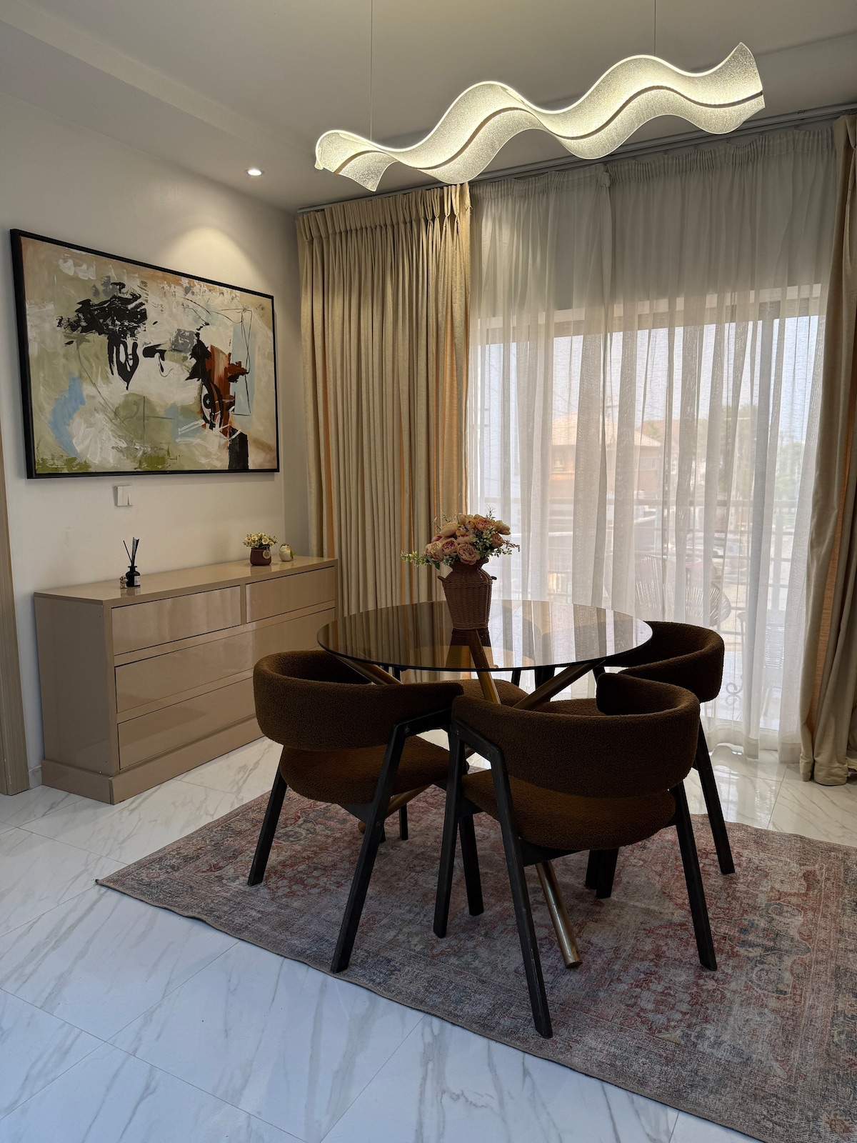 This apartment has a wonderful balance of style and functionality! The modern design emphasizes clean lines, open spaces, and minimalist elements. The abundance of natural light gives it a bright and airy feel, and the ability to control the amount of light, through it's curtains, adds a layer of comfort and adaptability. It offers: DSTV, Wi-Fi, PlayStation 5, Netflix, 24 hours power, security & single parking space.