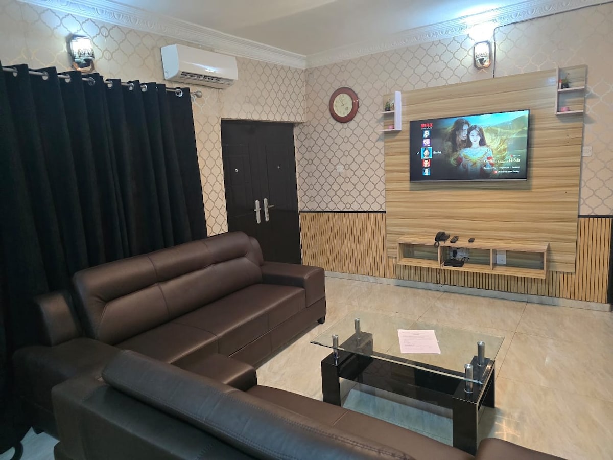 This Sparkling Clean Executive 2 bedrooms apartment comes with modern ensuite rooms with visitors toilets, Super king bed in all rooms and very spacious and massive. Unlimited fast WI-FI, 43inche Smart TV in all rooms and 55 inches Smart Tv in the sitting room. Water heater, Air conditioning, Netflix, YouTube, DSTV. Blinded cottons, water kettle, 24/7 electricity Band A from grid.Maximum security with uniform guards & trained guard dog. Spacious & clean compound with enough parking space.