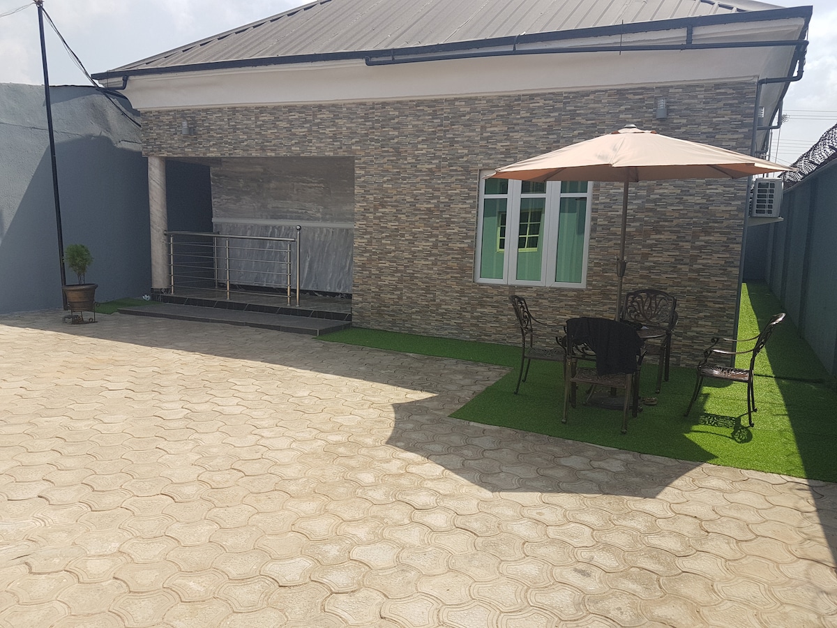 This Luxurious 2‑Bed Retreat with Bamboo themed Garden Oasis is the perfect blend of elegance, comfort and tranquillity in a beautifully appointed 2‑bedroom hideaway. Designed for discerning guests, this home offers a luxurious kitchen, a spacious bamboo‑themed garden, and the peace of mind that comes with staying in a secure and serene gated community. Highlights Elegant Master Ensuite Bedroom – High end Kitchen – Private Garden – Safe & Serene Location about 8 miles from Int'l airport
