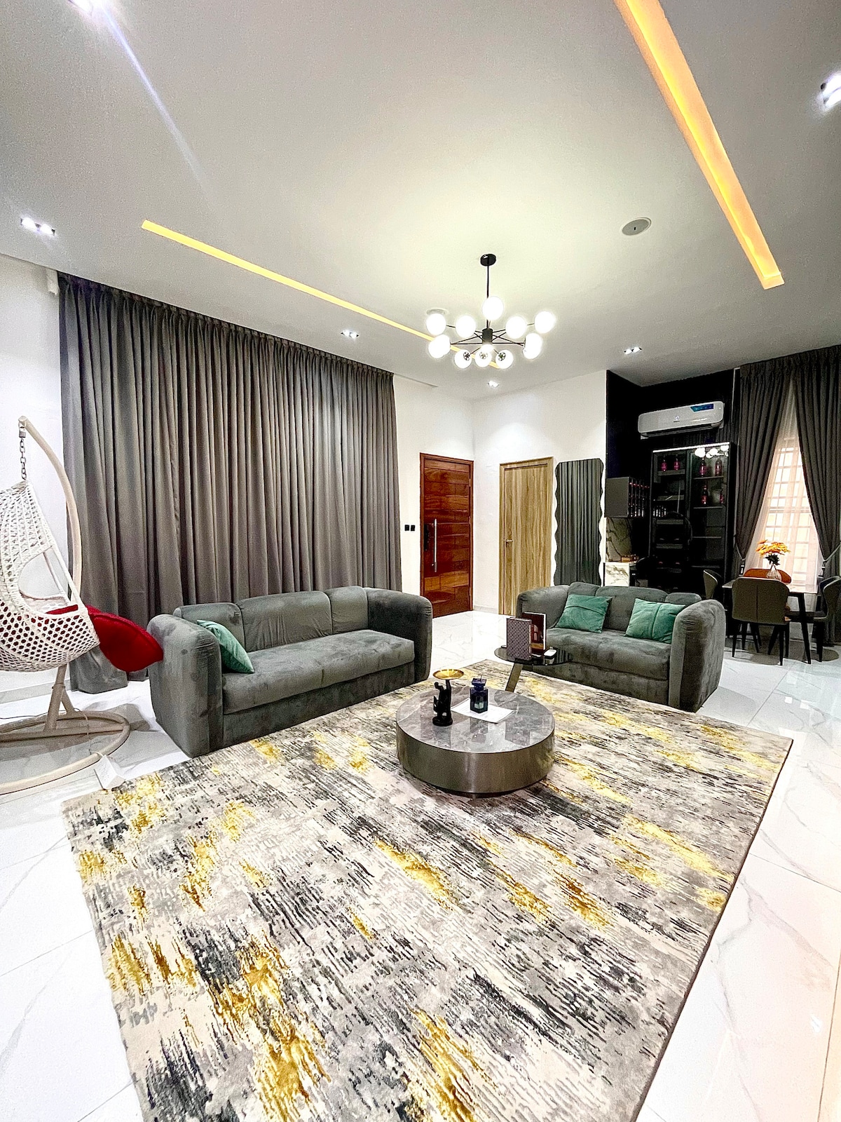 Nestled in the stunning Royal Pine Estate, Lekki. our 4-bedroom luxury homes are not just a place to stay but an experience. Picture this: a spacious living room where you can unwind, a master bedroom with a walk-in closet, and rooms that are all ensuite. We’ve got unlimited WiFi and Smart TVs in every room. Enjoy our gym, snooker, and table tennis facilities! And when it’s time to cook, our fully fitted kitchen has everything you need—think washing machine, and even a PS5 for entertainment!