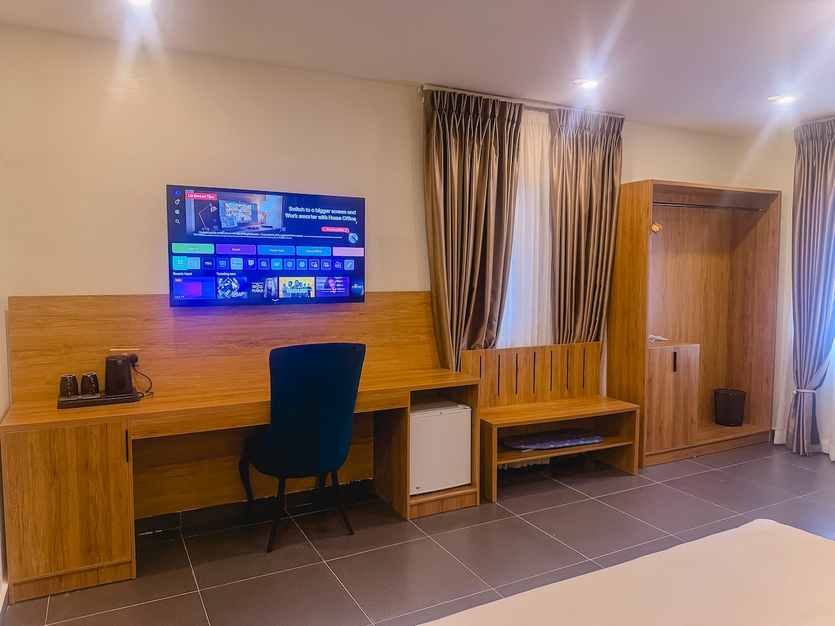 You’ll love the stylish decor of the Standard room. Enjoy the glamour of this stylish, upscale room. The Standard rooms are two in number. The decoration are different. But both has king size bed, tv, air conditioner, water heater, bathroom amenities, 24/7 electric, daily housekeeping, 24/7 front desk and general pool.