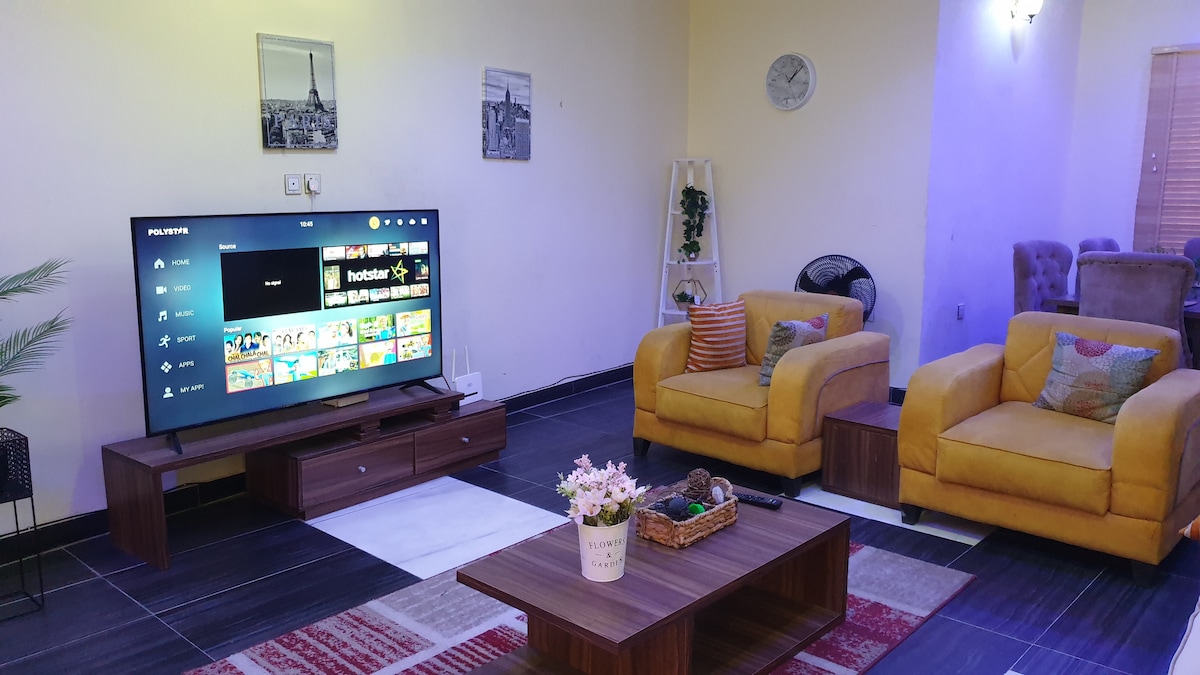 Very spacious comfortable & functional town house in estate. 24/7 Power H2O 5G WiFi 2 living rooms 1 dining 2 BRs, 5ACs Guest toilet Kitchen + washing machine. Pre-loaded NEPA card will be provided & full GEN It’s up to you how you manage the power WiFi. Fibre max Reducing CO emissions -24 hr free solar energy that powers 2 inverter ACs IMPORTANT: book in exact number of guests staying to avoid issues if only 1 or 2 persons booked the second room will be LOCKED Driver ONO CCTV