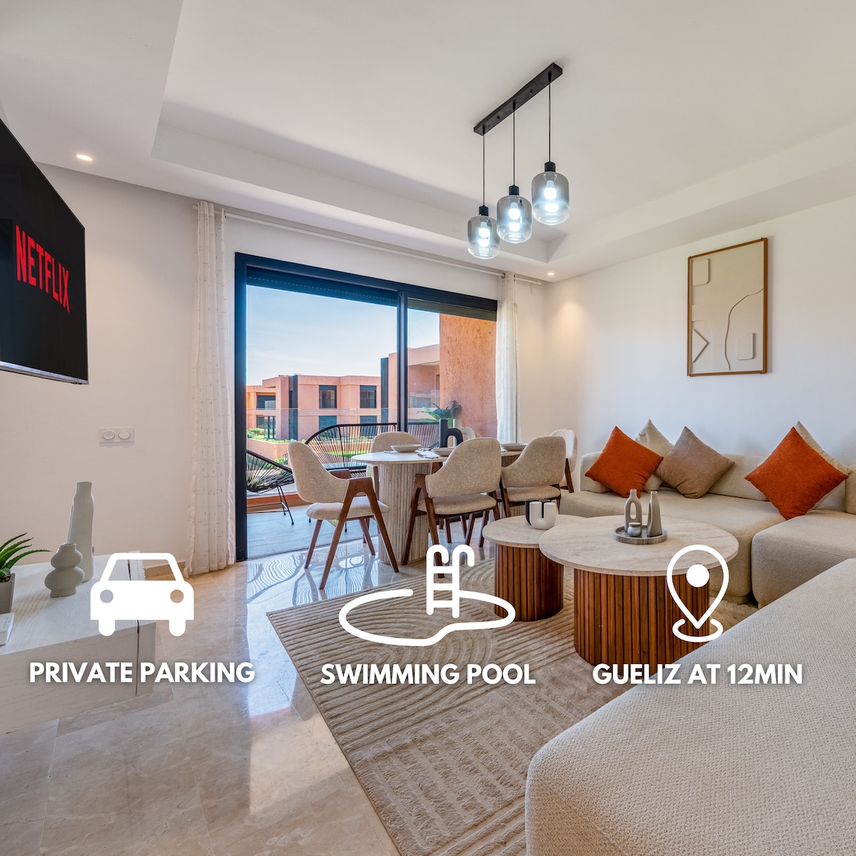 🌼Découvrez notre appartement dans une résidence calme, idéale en été comme en hiver ! Situé derrière le restaurant BO ZIN, sur le boulevard Mohamed VI, dans une résidence sécurisée, à seulement 5 km de l’aéroport et 7 km de la gare. À proximité : centre commercial Al Mazar, place Jemaa el-Fna, parc aquatique Oasiria, karting, cinéma, bowling, et plusieurs restaurants incontournables.🌸