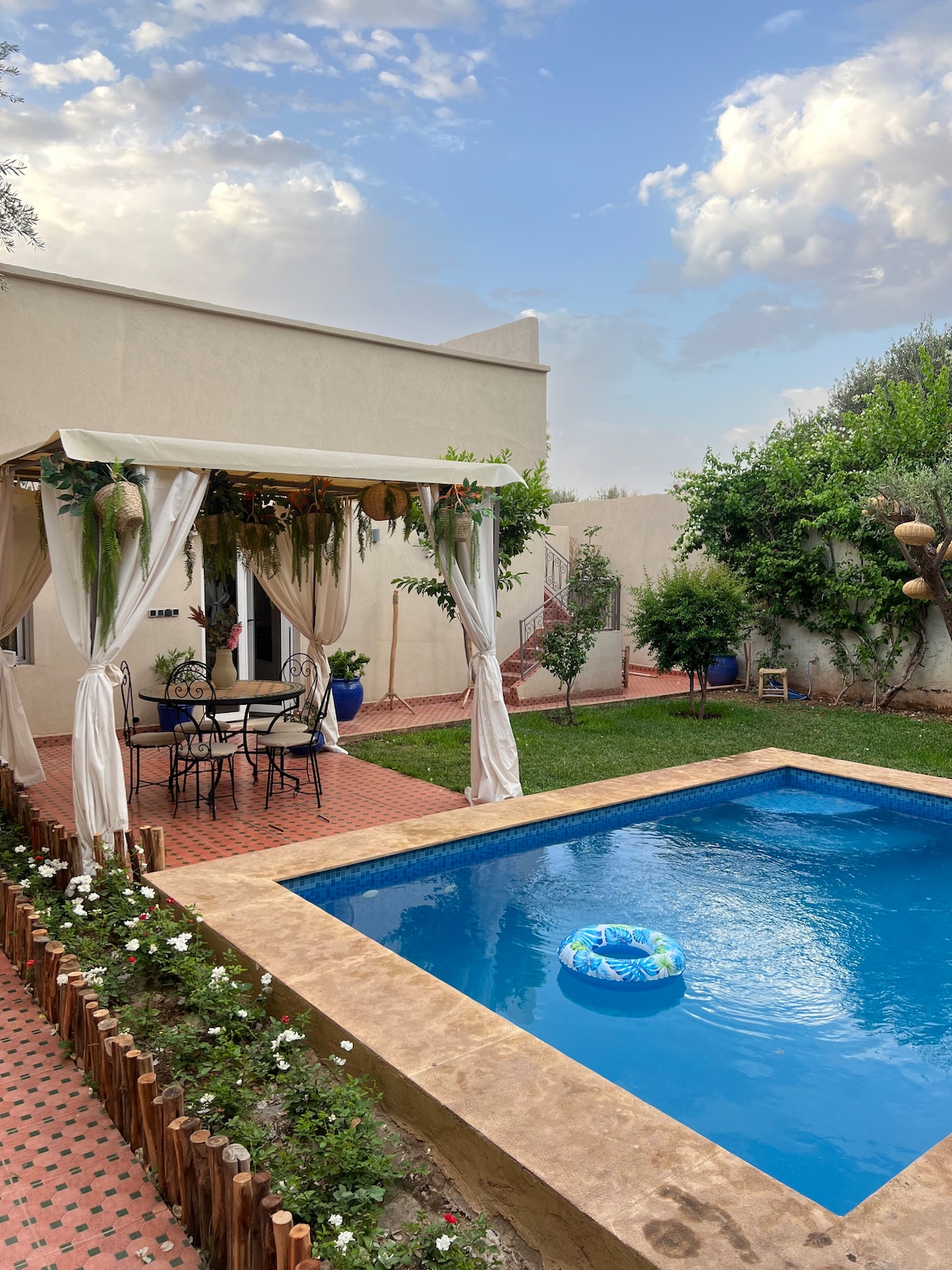 Villa de charme avec piscine privée sans vis-à-vis, à quelques minutes du centre de Marrakech. 🌴 2 chambres avec salle de bain, 1 salle de bain commune, 1 salons lumineux et jardin paisible, spacieuse 💎 Entièrement climatisée, idéale pour couples, amis ou familles, quartier populaire calme 🍽️ Services : cuisine marocaine à domicile, location de voiture & expérience à Marrakech. 🏘️ résidence sécurisé 24/24 📈 Réductions exclusives : -20% mois, -7% semaine, -3% dernière minute sur séjours