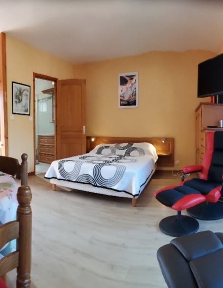 Charmant meublé de 35m² en rez-de-jardin, terrasse, jardin privatif ensoleillé. Situé à seulement 400m des Thermes et à proximité immédiate du centre du village et des commerces accessibles à pied. ✅ tout confort pour 4 personnes ✅ 1 chambre lit 180 et canapé convertible 2 places. ✅ Cuisine équipée, télévision, wifi ✅ Abris voiture avec recharge électrique Résidence calme de 4 logements, entourée d’espaces verts et boisés, avec une jolie vue sur le village.