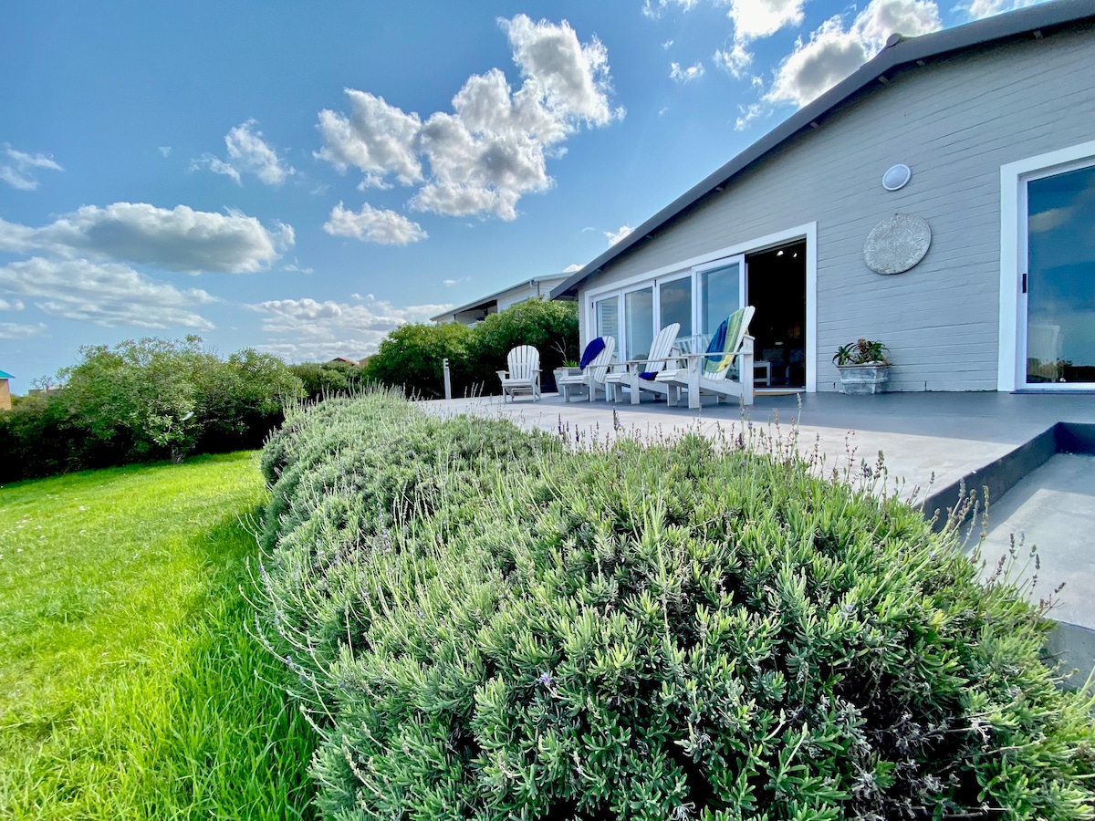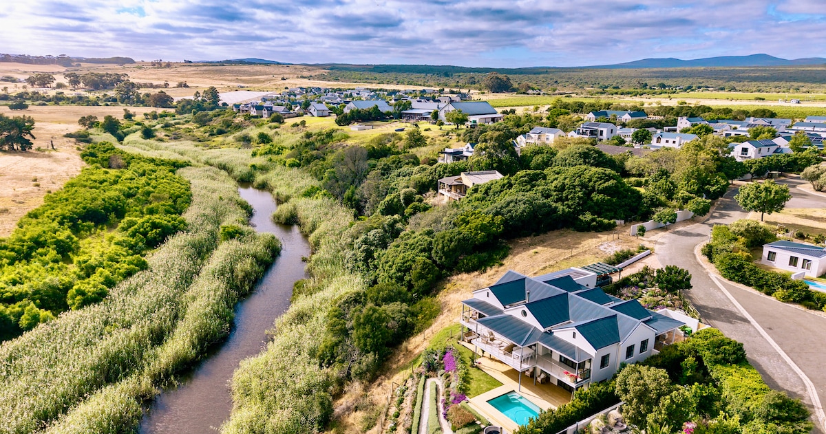 Beach house meets farmhouse, newly built in 2018, where industrial design blends with earthy materials and the natural landscape around you. The house has three porches and was purposefully built to enjoy the Overberg views in every direction. The house is spacious, private and tranquil while still being only 2 minutes away from the shops in town. Stroll down to “Meelmuis” deli for a coffee and panini. Things to do: Bring your MTBs, surfboards, kayaks and walking shoes.
