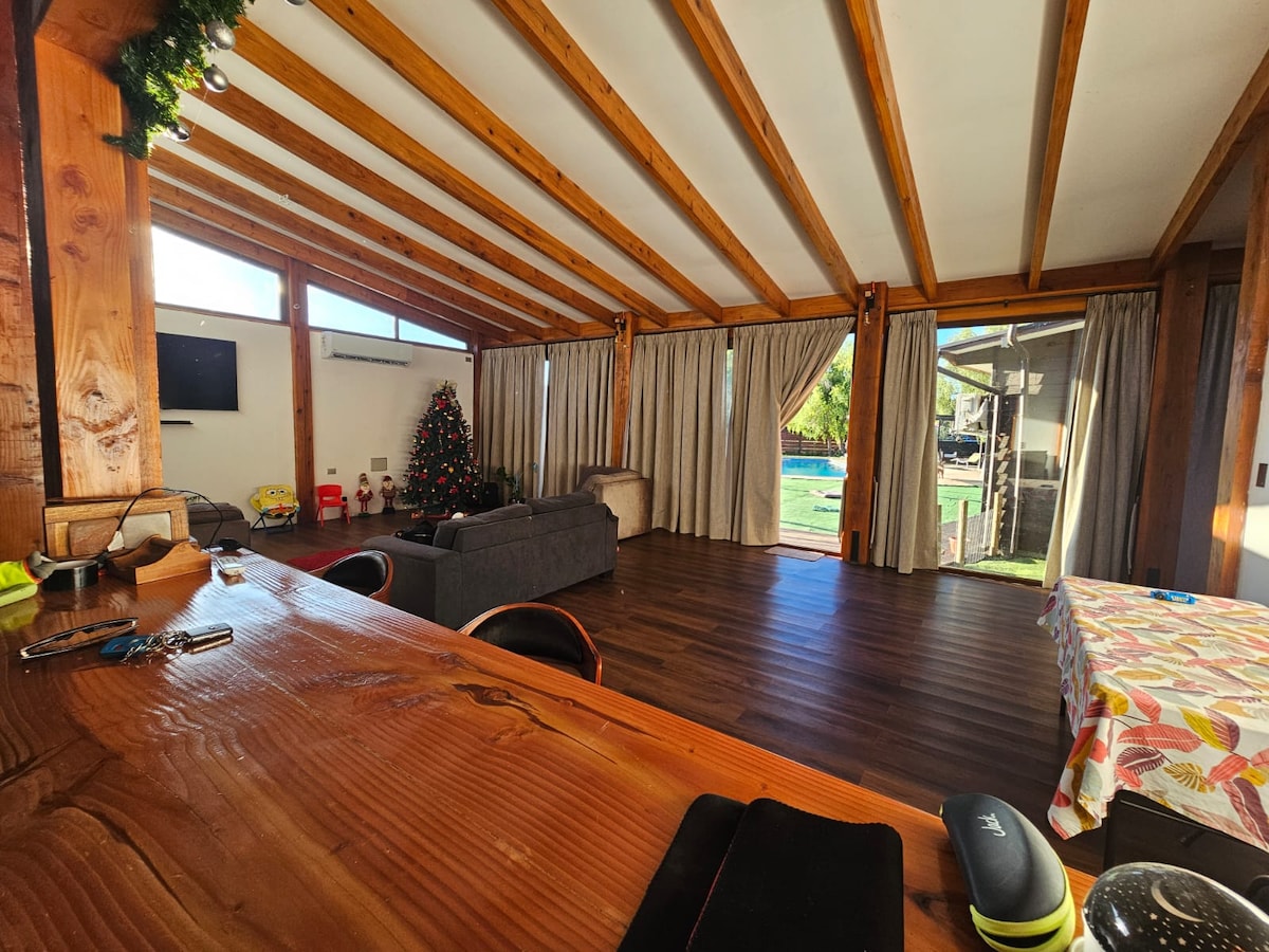 Casas EXCLUSIVAS Y PRIVADAS DE LUJO, remodelada completamente interior y mobiliario nuevo para tu familia 3 Habitaciones, 3 Baños, 2 Jacuzzi, A/C, Piscina, Quincho totalmente equipado, Sauna, Tina madera agua caliente, Horno de Barro, Juegos Infantiles, Acceso privado a rio, 6000 mt2 de TRANQUILIDAD y SEGURIDAD para ti y tus hijos, COMPLETAMENTE PRIVADO! Habitación 1: Cama King +1 Litera 1 plaza+ 1 baño en Suite Habitación 2: 2 Literas Habitación 3: 1 Cama 2 Plazas + 1 Litera. Baño visitas.