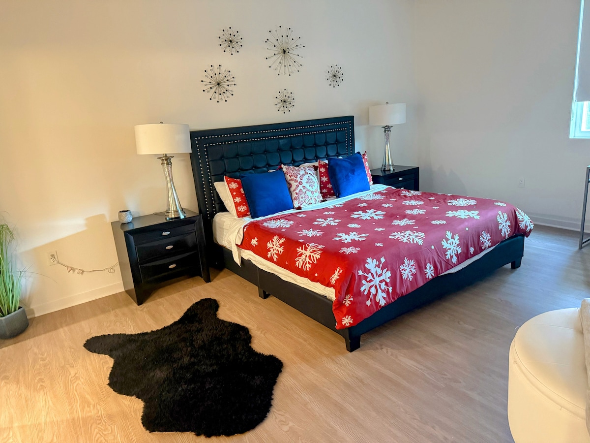 Stylish private apt is perfect for family of 4 with queen bed & comfortable air mattress &full kitchen with a GE double oven range and a 5 burner cooktop & pots & pans & with diningroom table, comfortable sofa & 54" TV. Outdoor community swimming pool. We keep apt immaculate & disinfect after every stay. Front loader washer & dryer on premises. Dinnerware & flatware & coffee & tea & bottled water. Every linen & towel is freshly laundered with Non allergenic detergent, baking soda & vinegar