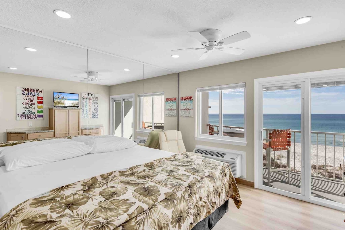 Located in Tower 1 on the 9th floor, our studio offers breathtaking, unparalleled panoramic views of the Gulf of Mexico. This oceanfront condo features standard furnishings and ample space, making it the perfect opportunity for a romantic getaway in one of PCB's most popular resorts: Majestic Beach Resort. This space will feel like a hotel just feet away from the beach. Beach service is included (2 beach lounges and 1 umbrella) from March 1st to October 31st, valued at $60 per day.