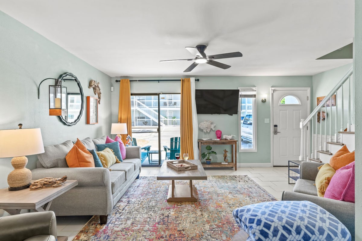 Escape to a newly renovated, slice of paradise in quiet Sunnyside. - Beachfront views - One Beach Chair Set Up (2 Chairs + Umbrella) Provided April - September (no guarantee for last minute bookings) + 4 folding chairs - townhome with 3 bedrooms - 2 King & 2 Queen beds - 2 full bathrooms & 1 half bathroom - TV’s in bedrooms & living room - Fully stocked kitchen essentials - Dining table for 8 - Screened-in porch viewing the beach - Patio with sun chairs & grill - Starter amenities