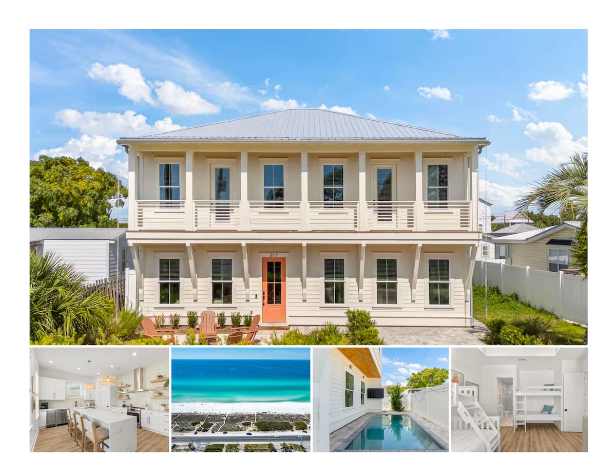 Palms by the Beach has a luxurious homey feel with pool, outdoor shower, private yard, 7 mins walk/3 mins drive to the beach. Great for a family or friends getaway! Perfect location! Less than 10 mins drive to Pier park, 8 minutes to Rosemary Beach & 30A. Destin is a short drive too! Feel at home with a fully stocked kitchen. Comfortable bedrooms and outdoor space with dining and grill area. 2 Adult Tricycles and 3 Kid scooters included! 4-seater Golf Cart available for rent $85 a day!