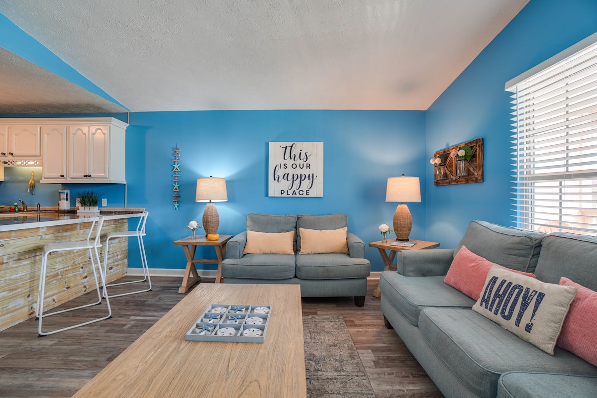 Enjoy a relaxing and refreshed condo in a quiet resort only a 4 minute walk to the beach. No high rise or elevators to deal with. A quiet corner condo with your own private balcony up one flight of stairs. The resort offers 4 swimming pools (one heated pool), hot tub, mini golf, tennis courts, basketball court, fitness room, pool table, & shuffleboard. Only 2.5 miles from Pier Park for tons of shopping, dining, and fishing.