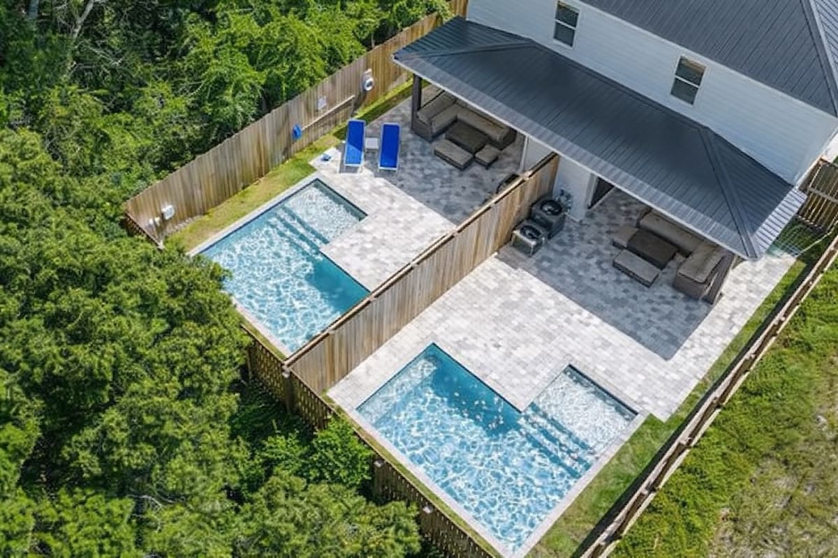 Welcome to this relaxing coastal getaway. You'll enjoy the pool, covered patio for grilling, and taking in the sunset on the deck upstairs. The home sleeps nine, has a brand-new kitchen, family room to unwind, and blazing fast internet to work or stream movies. You'll be just a ten-minute walk to the beach, and a short drive from 30A and Pier Park. We are dog-friendly with payment of a $170 pet fee. Three dogs maximum. Pool heating is available for $40/day. Details below.
