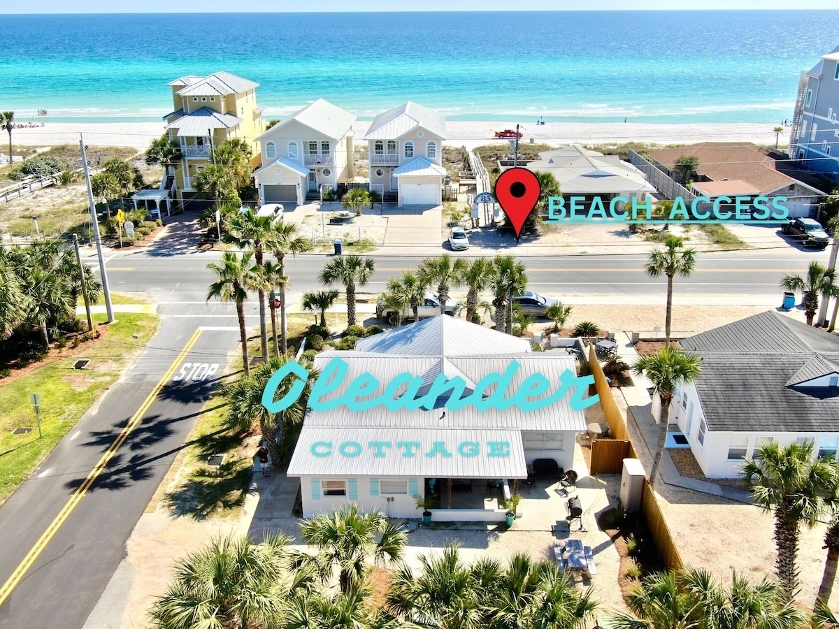 One block to the dedicated beach, no high rise condos. Three bedroom two bath house. One bedroom has queen bed, private bath with walk-in shower. The other two bedrooms, one queen and one with two bunk singles, share the hall bath which has a tub/shower. Well stocked kitchen. Patio with outdoor seating and grill. Two TVs, WiFi, 1G cable internet with a dual-band 2.4+5 GHz router, Roku - Fubo streaming TV. Three miles to Pier Park a variety of shopping, restaurants and entertainment.