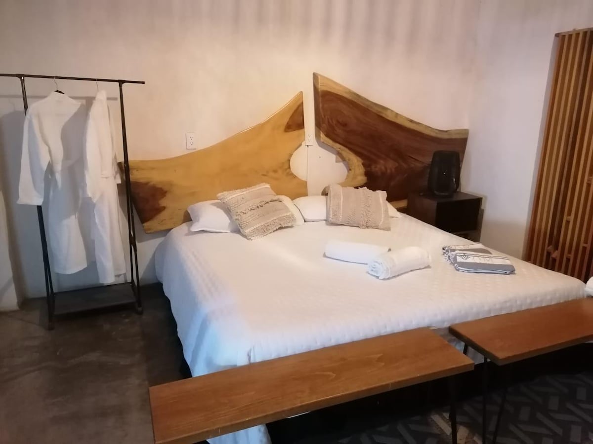 Dalia es una de las ocho habitaciones de Hotel los Tamarindos. A nivel de planta baja tendrás acceso a la recepción, el estacionamiento gratuito, la increíble naturaleza que engalana nuestro espacio, la piscina con agua fresca y las magníficas terrazas en donde podrás consumir deliciosos platillos, bebidas, coctelería y snacks. El hotel está ubicado entre el cerro y el corazón palpitante del pueblo de Tetecalita, lo que proporciona exclusividad, encanto, privacidad y hermosas vistas.