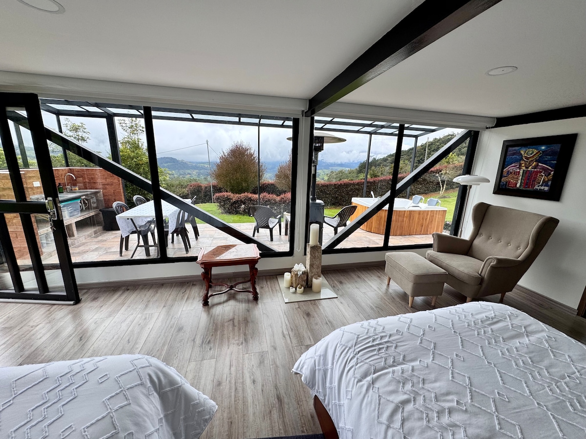 If you love nature, comfort, and tranquility with easy access to the city, this mountain retreat is for you. Set on a 1-hectare property just 10 min from La Calera and 45 min from Bogotá, the house offers panoramic views, a cozy living room with fireplace, a spacious bedroom with TV and second fireplace, a den with bathroom, a fully equipped kitchen, a glass-covered terrace, BBQ area, fast Wi-Fi, and Smart TVs—ideal for relaxing, working remotely, or exploring the region.
