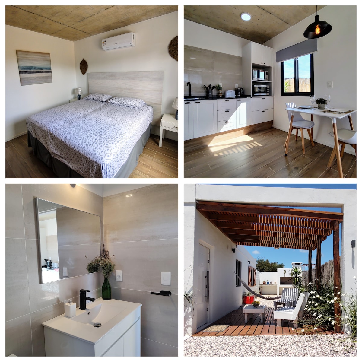 Relajate en este espacio tranquilo a metros del mar y la laguna de José Ignacio. Hermosa casa de un ambiente en La Juanita, José Ignacio a 200 mts del Mar. Te va a encantar por el estilo y su comodidad. Es ideal para parejas, o parejas con bebés, con cama super king + sofá cama, pudiendo alojar hasta 3 personas. La casita se encuentra en un predio natural de 450 m2 que comparte con otras 2 casitas, cada una con su espacio independiente.