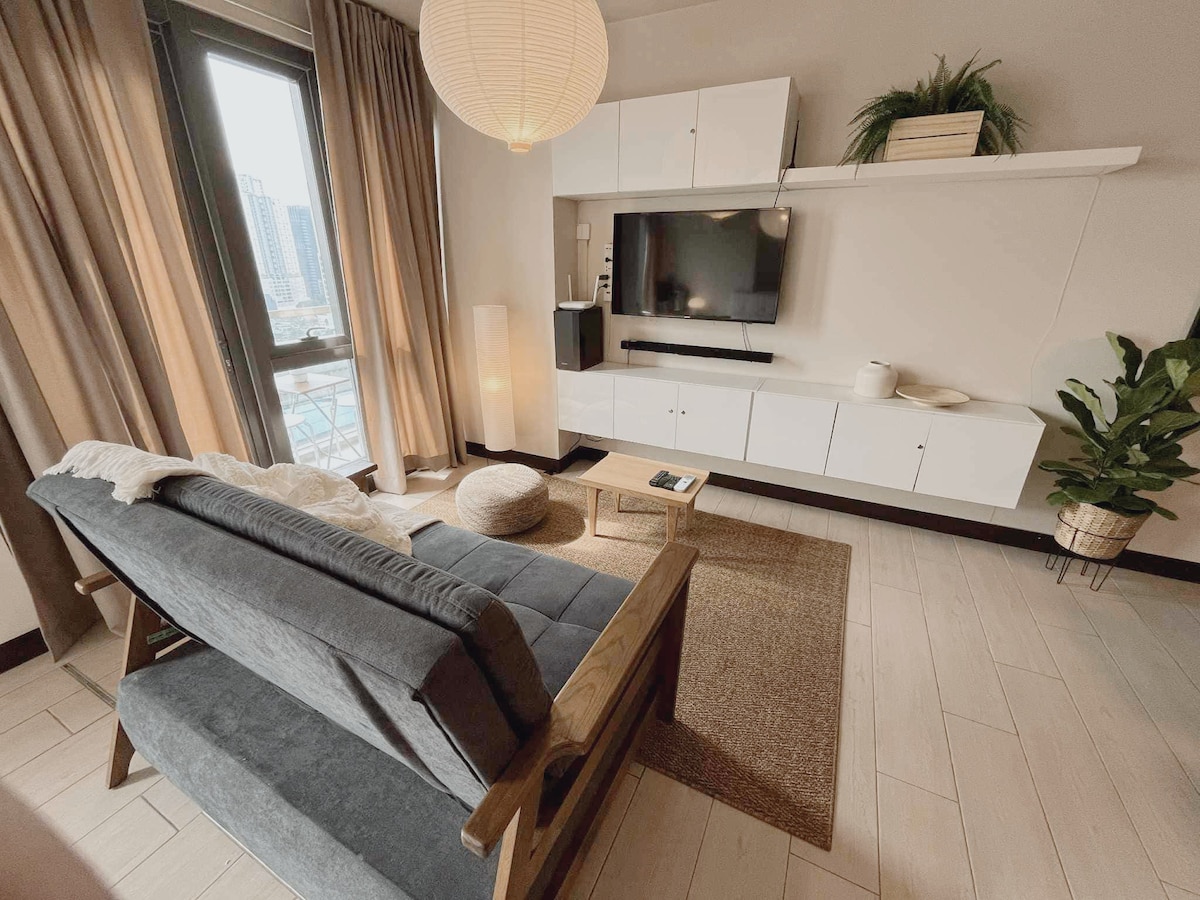 Feel stylish and experience the BGC vibe at this centrally-located place. Get direct access to Uptown Mall. This place is also just across the newly opened Mitsukoshi Mall. Our newly renovated place is bright and airy with a fantastic view of the Uptown Mall fountain show. Take an easy stroll as all major points of interests are just a few mins walk. Feel the energy of Uptown BGC. Shop, dine, or just have a relaxing break at the corner cafe. Come feel the energy of this vibrant community!