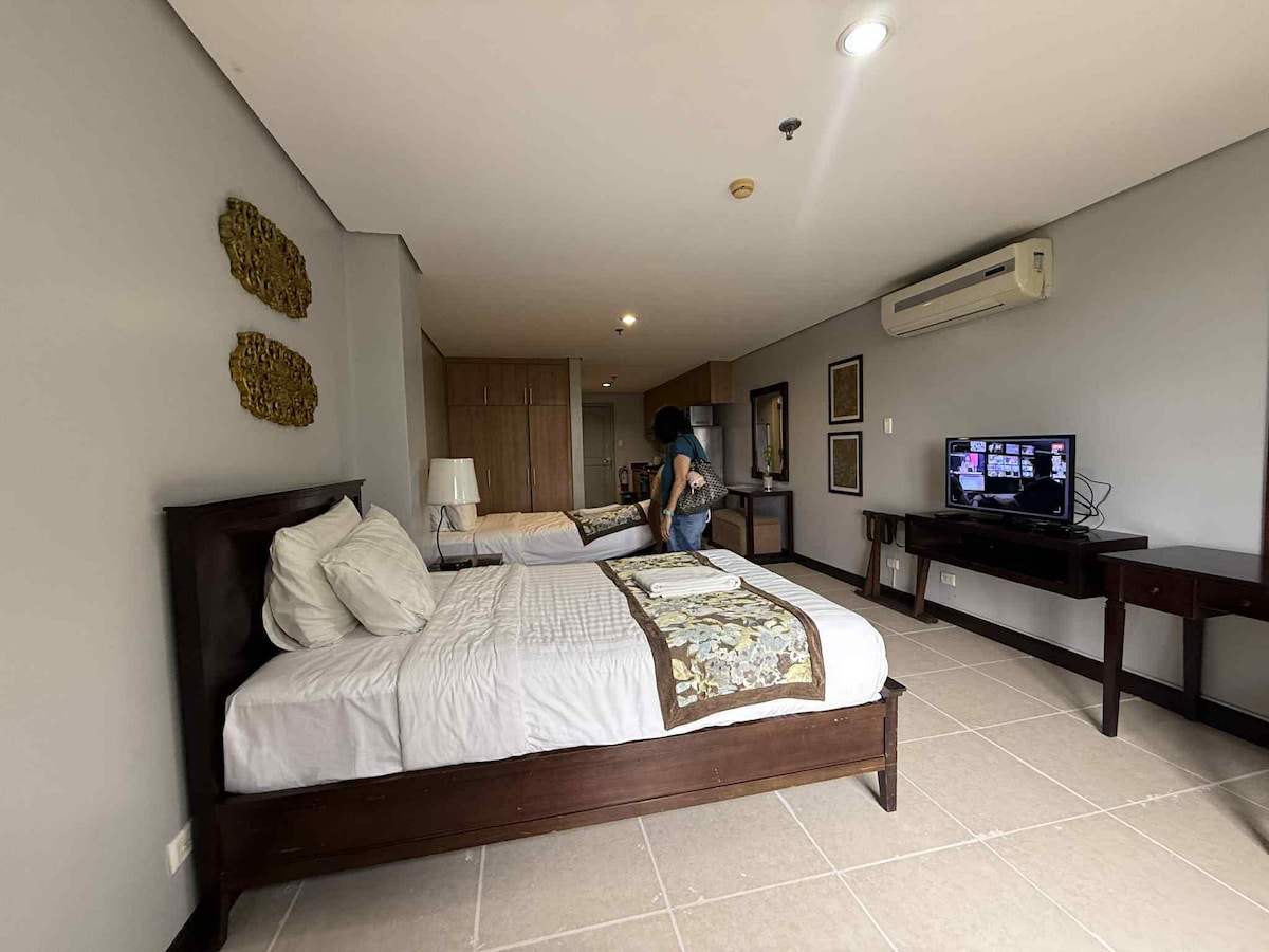 Brand new studio equipped with king and pull-out queen beds perfect for a family of 4. Located on the 3rd floor of the newest Swiss condominium of Crosswinds Luxury Resorts, the Grand Quartier 3, this corner unit of 48 square meters boasts of breathtaking views from its outdoor balcony. Complete with kitchen equipment and utensils, guests may enjoy the flavors of home cooking in the perfect home away from home. The room is highly sterilized using UV lights to ensure safety.