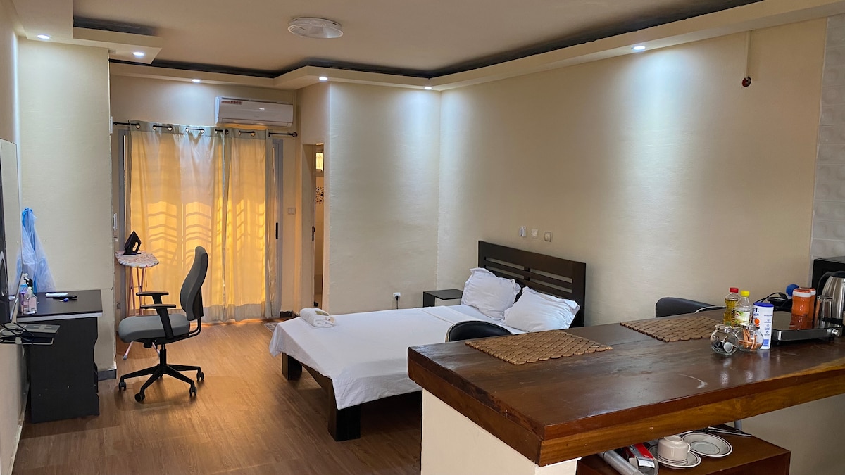 Beau studio sécurisé avec gardien de jour et de nuit.Accès facile Rez de Chaussée avec ouverture sur une petite terrasse. il dispose d'un grand écran de 55 pouces, un coffre fort, une enceinte Bluetooth avec un son de qualité Harman/kardon, un lave-linge, un fer à repasser , Robot aspirateur , assistant Vocale connecté , purificateur d'air et autres équipements. Le sol de la chambre est vêtu d’un parquet flottant