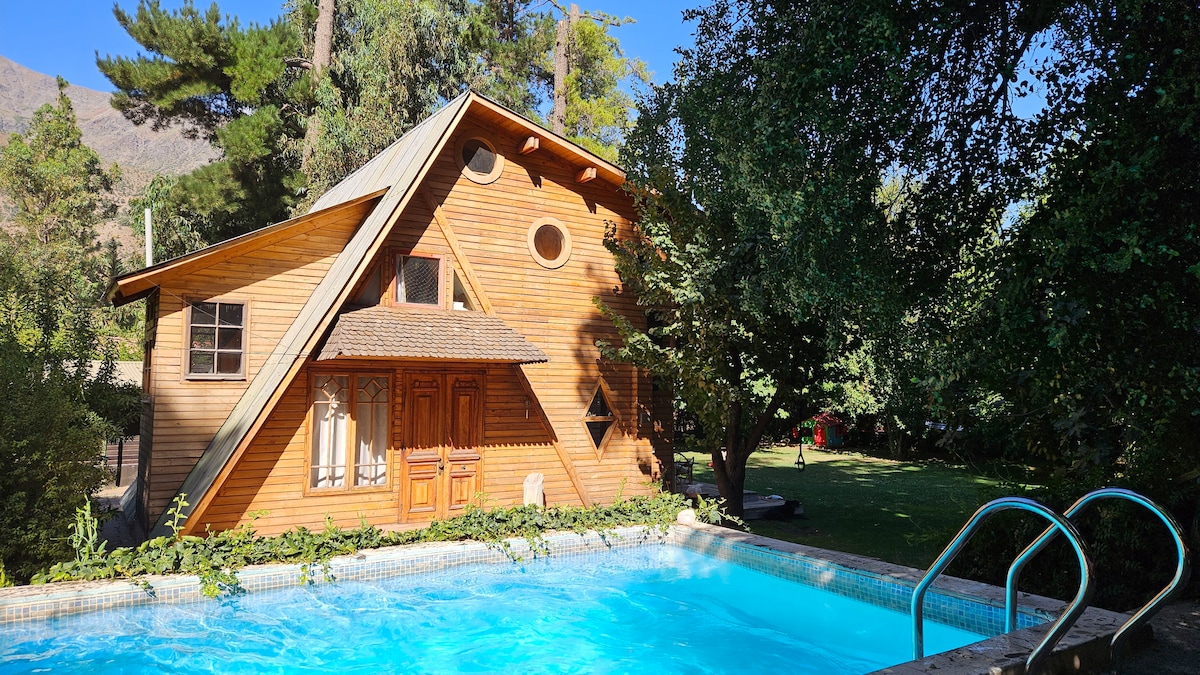 Cabaña rústica independiente en el Cajón del Maipo, rodeada de vegetación. Queda a 45 Km de Santiago (alrededor de 1 hora) y a 4 kilómetros de San José. Tiene 2 dormitorios, el principal con cama matrimonial y el segundo con cama de plaza y media, y living con estufa a leña, más futón. Cuenta con cocina-comedor full equipada, WIFI, TV Cable, terraza techada, pequeño quincho con asadera, piscina y acceso a bosque con árboles nativos, hamacas y juegos para niños. Tiene estacionamiento.
