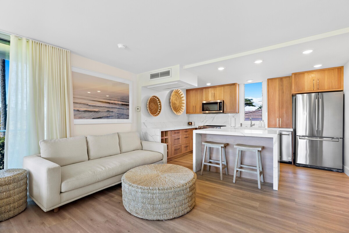 Locally Owned and Operated 1BD/2BA condo with the best direct beachfront location, panoramic Ocean views, sunsets, and seasonal whale watching. The owner’s spared no expense in renovating this unit making it hand’s down one of the nicest units in all of the Mahana. Wake up to the cool tropical breeze and sounds of the shoreline just 50 feet away. Floor to ceiling windows in the living area and bedroom bring the stunning views and warm Maui sun inside while central AC keeps you cool inside.