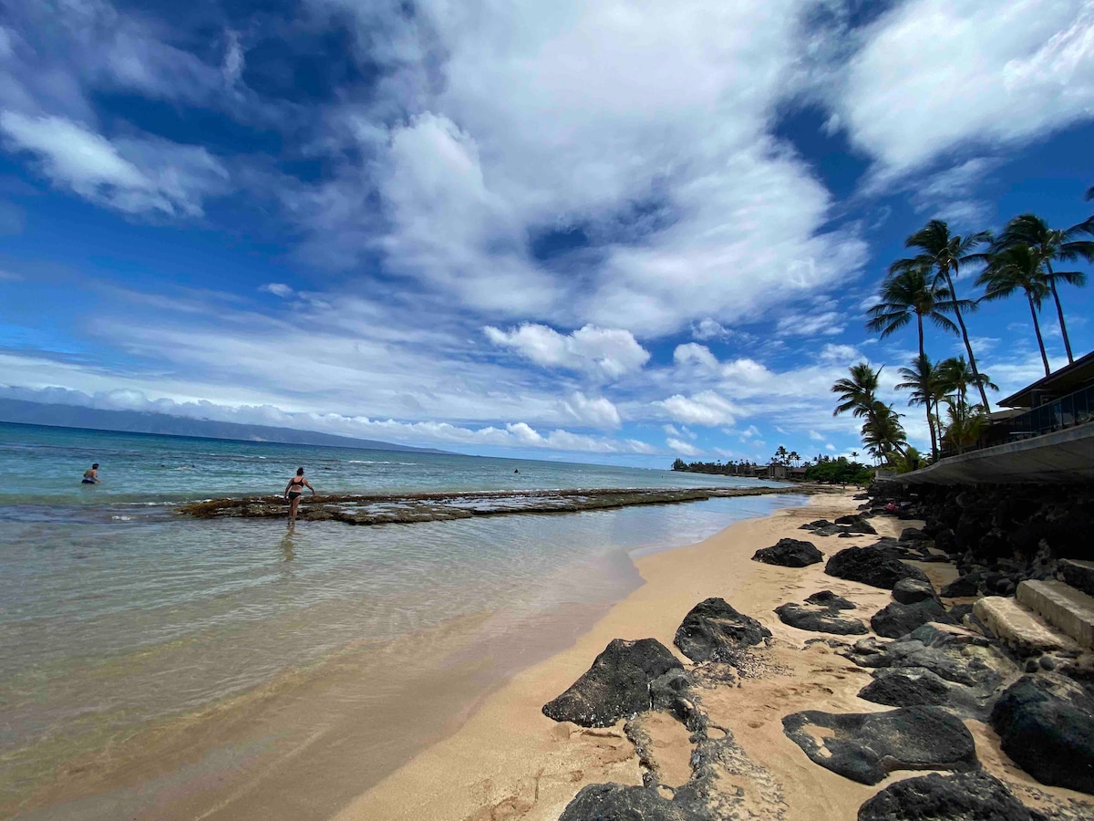 🌊 Stunning renovated oceanfront ground floor suite in Kahana Reef! Watch whales and turtles from your private lanai, enjoy spectacular sunsets, and stay steps from the pool. King bed, sofa sleeper (sleeps 4), full kitchen, A/C, beach gear included. Perfect accessible location between Kaanapali and Kapalua!