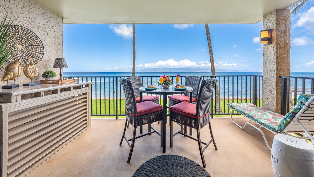 *Available for booking! Thankfully, our condo is not located in the wildfire affected area* Enjoy breathtaking panoramic views in this remodeled oceanfront corner condo located on Kahana Beach! With floor-to-ceiling windows in both the living and bedroom, gentle breezes and sunsets can be enjoyed lounging on the couch or relaxing in bed. Imagine falling asleep to the lull of ocean waves at your feet and waking to spouting whales in the background. Truly an oasis on the Valley Isle.