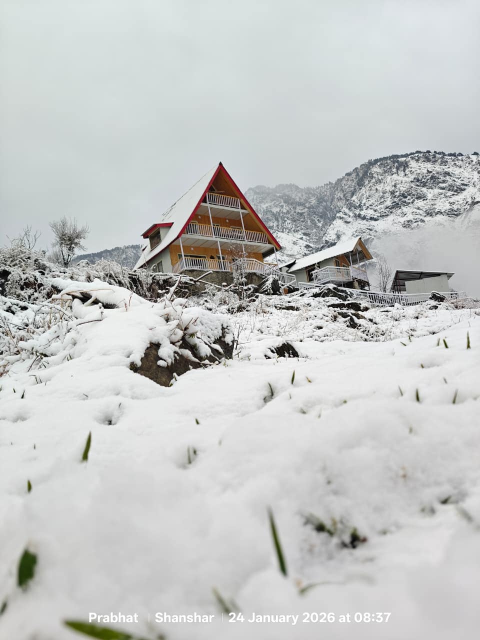 Welcome to our fairytale 'Evara' – meaning 'gift of God.' Nestled in the tranquil village of Naggar. Evara is a beautifully crafted wooden duplex cottage offering peace, comfort, and stunning mountain views. Surrounded by lush apple orchards and nature's quiet charm. This serene getaway features balconies on three sides, allowing you to soak in breathtaking vistas from sunrise to sunset. Warm & cozy interiors, a full kitchen, and a luxurious Jacuzzi to unwind after a day of exploring.