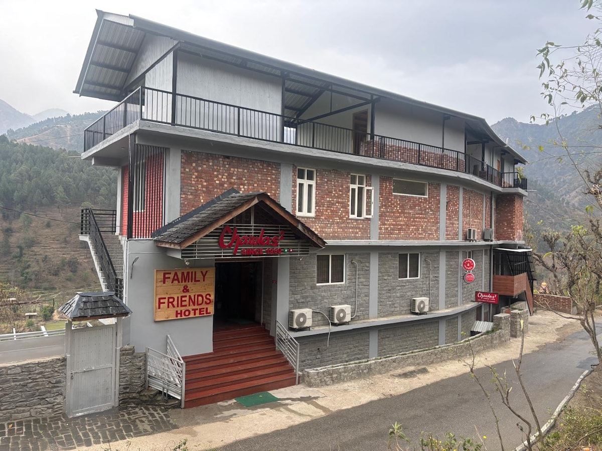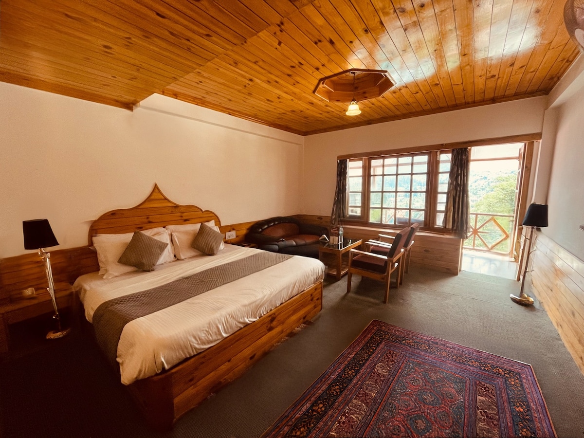 Designed for families and small groups, our spacious Family Room blends modern comfort with warm mountain aesthetics. The room features a plush king-size bed and an additional sleeping area, making it ideal for parents traveling with children or friends staying together. Room Highlights: • King-size bed + extra sleeping space • Spacious layout with wooden interiors • Cozy seating area • Large windows with peaceful views • Flat-screen TV & wardrobe • Clean, modern attached bathroom
