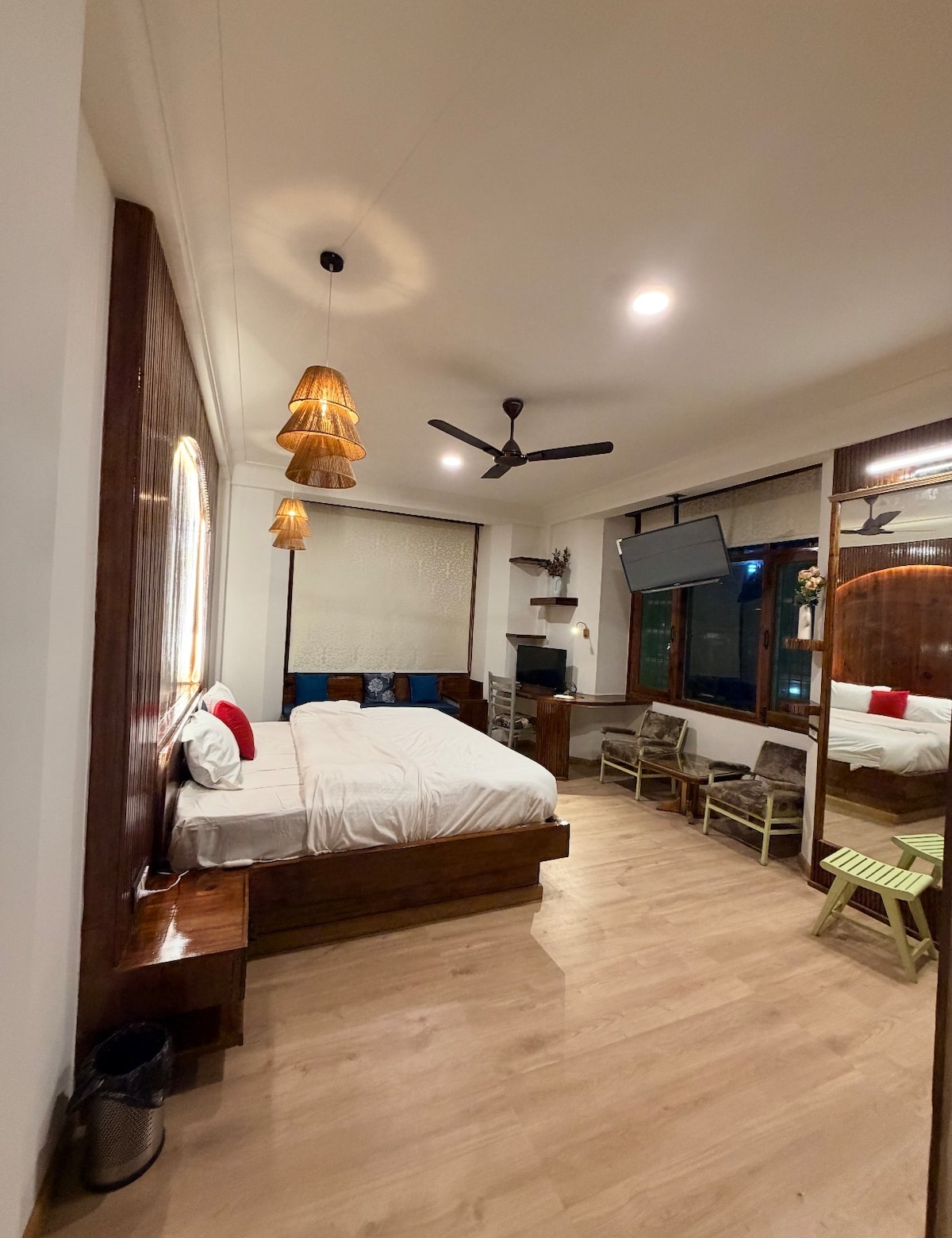 Enjoy a peaceful stay in this spacious room with stunning mountain views. The room features a comfortable king bed, cozy seating area, large windows with natural light, and a private balcony overlooking the valley and snow-capped mountains. Guests also have a modern attached bathroom with hot water, a workspace, and a TV for a relaxing stay. Perfect for couples, families, or travellers looking for a calm mountain getaway.