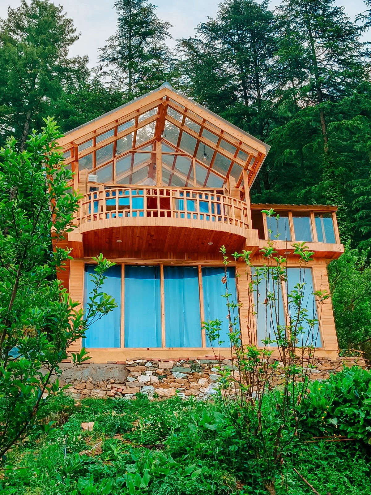 Sainj 喜马拉雅雪松旁的玻璃屋