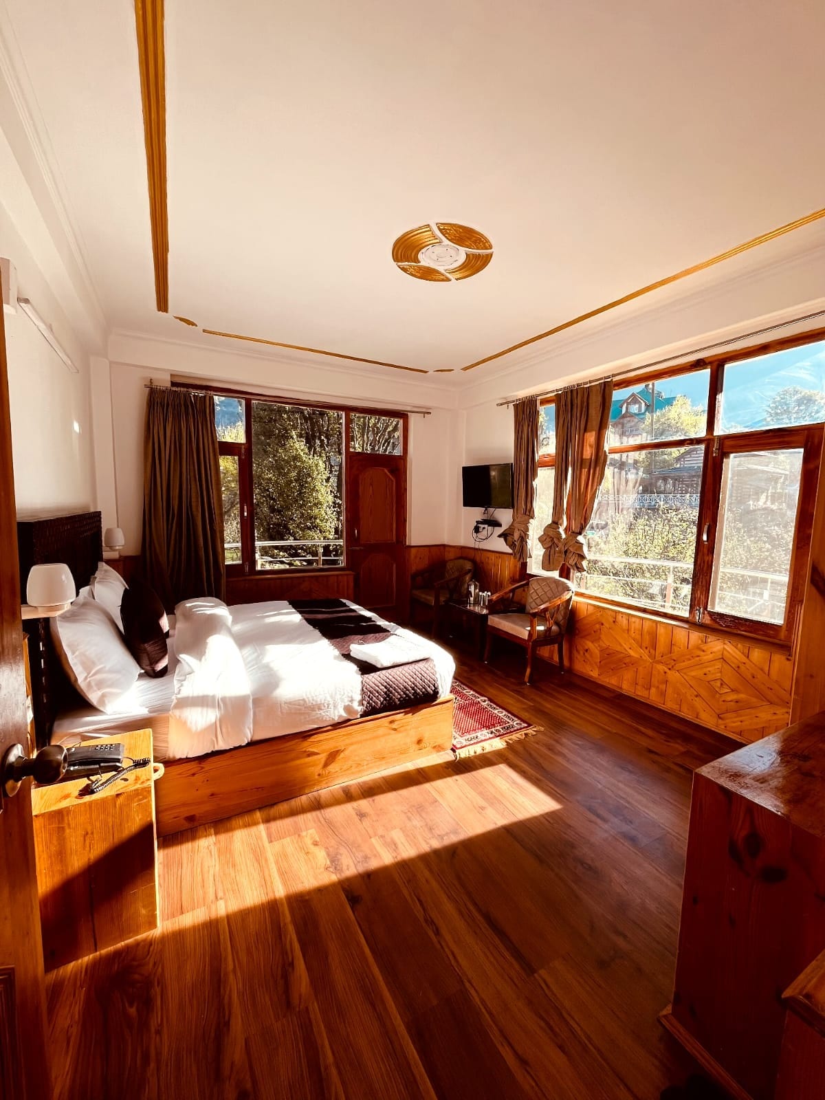 Stay at our luxurious 5BHK cottage in Manali, set on the banks of River Beas with stunning views of snow-capped mountains, apple orchards, and the valley. Each room has a balcony & attached bath, while the villa offers a spacious living & dining area with fireplace, elegant wooden interiors, and a fully equipped sit-out. Perfect for families, honeymoon couples & groups, this exclusive retreat combines comfort, nature, and location for an unforgettable Manali stay.