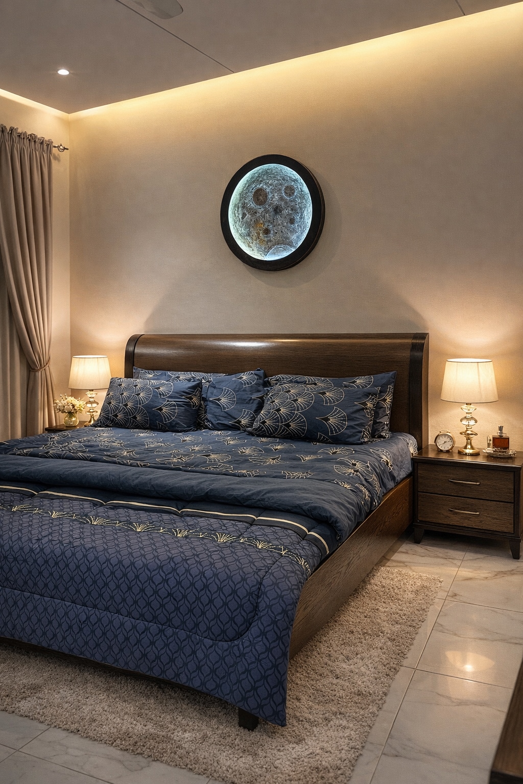 Our 1 BHK Orbit Penthouse in DHA Phase 5 is where urban chic meets celestial cool. Think: a glowing moon wall for those late-night selfies and a bold dollar-stacked art piece that screams "main character energy" Wake up to park views from your private balcony swing, binge your faves on the 50" 4K Smart TV, or cook up something aesthetic in the fully loaded designer kitchen. The interiors? Abstract, stylish, and made for the feed. Plus, you're right next to Lahore's hottest dining spots.