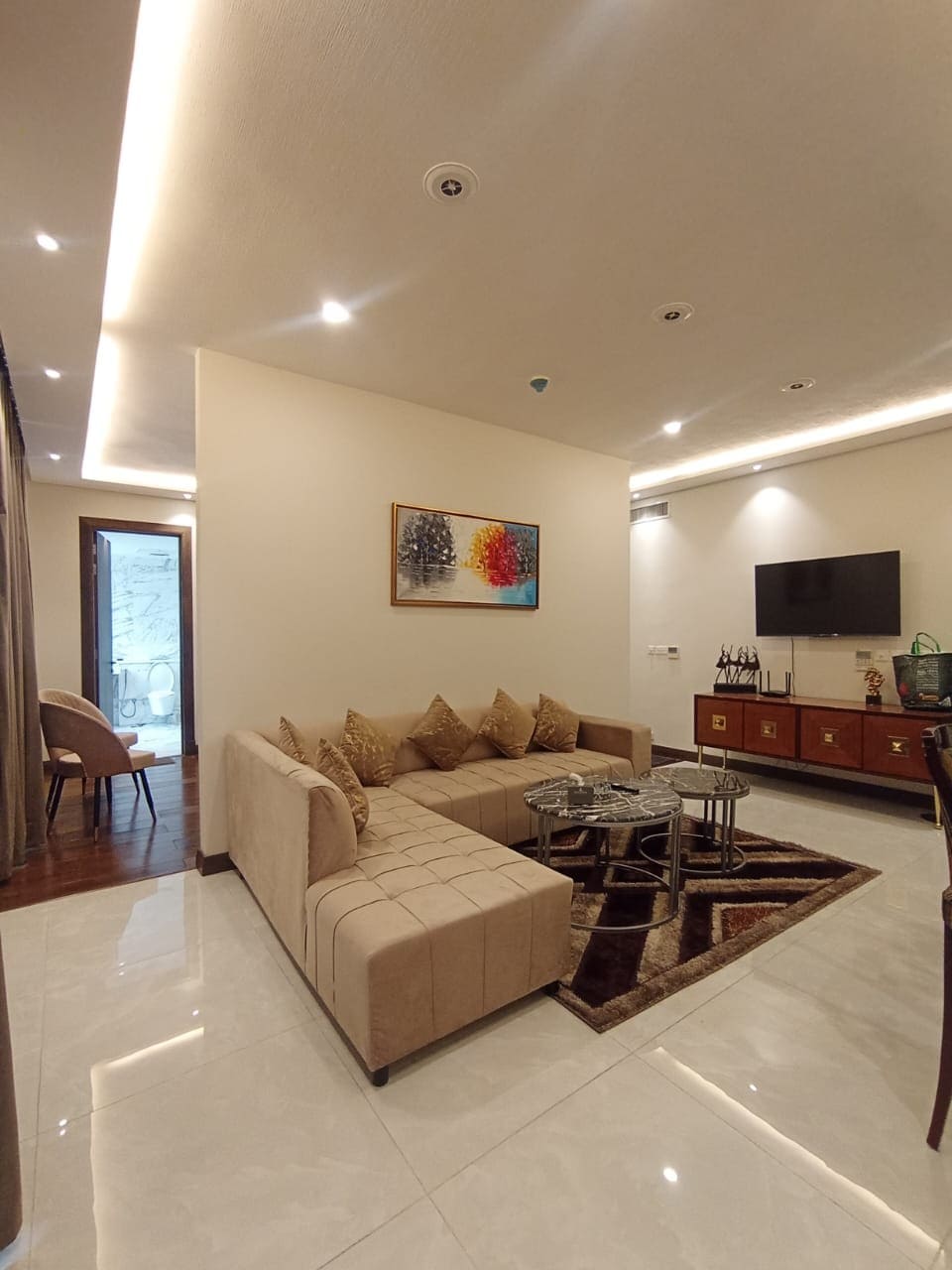 This cozy and well-maintained apartment is located in the heart of Gulberg, one of the most central and secure areas in the city. Ideal for both short and extended stays, the space is thoughtfully designed to offer comfort and convenience. A big 65inch TV is installed in the lounge for your great chillings. A 5.8ft dinning is also placed for your hunger needs. A large SOFA in BOUCLE to provide you the Premium vibes you deserve.