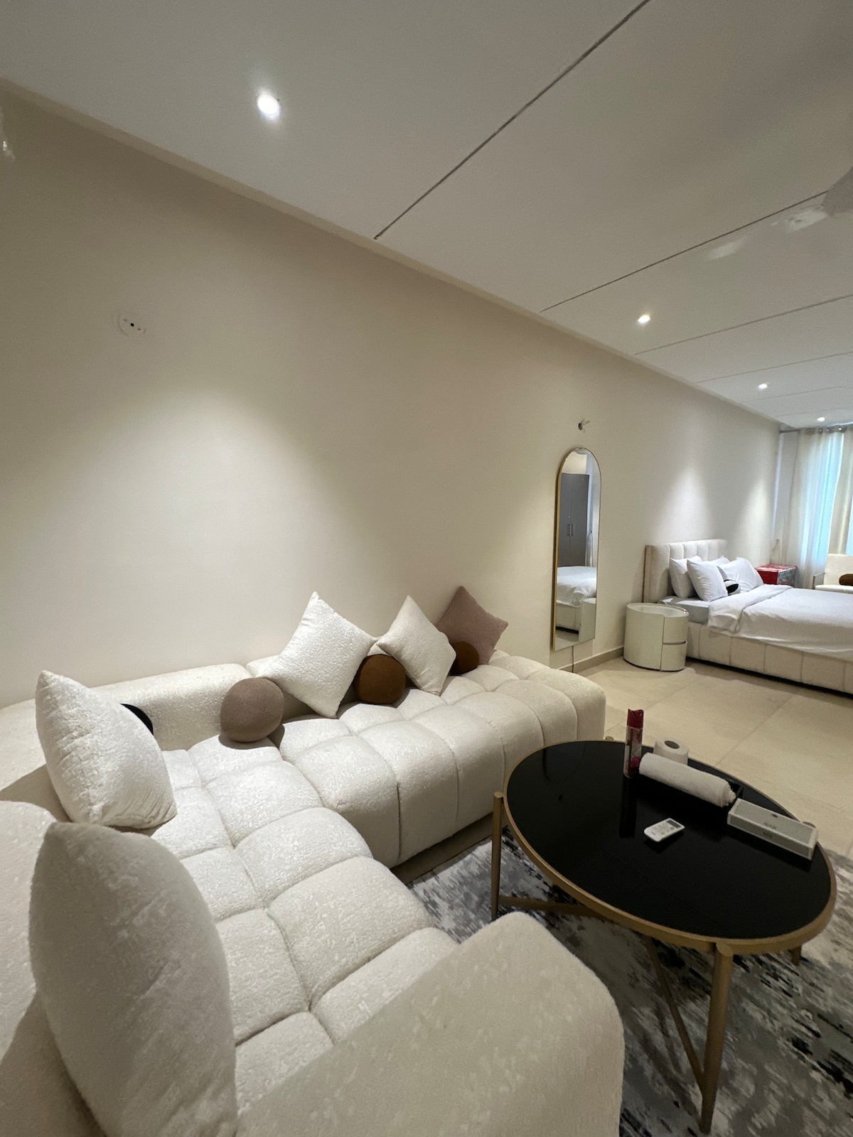 Welcome to Daró — a boutique, design-forward 1-bed apartment in the heart of Zameen Aurum, Gulberg III. Thoughtfully crafted with soft tones, modern furnishings and a calm hotel-like ambience, this space offers a private balcony, a stylish lounge with a 55” LED, a fully equipped kitchenette, fast WiFi, fresh linens, and 24/7 hot water. Ideal for married couples, business travelers, weekend escapes and long-term stays seeking comfort, convenience and a truly elevated experience in Lahore. 🌙✨