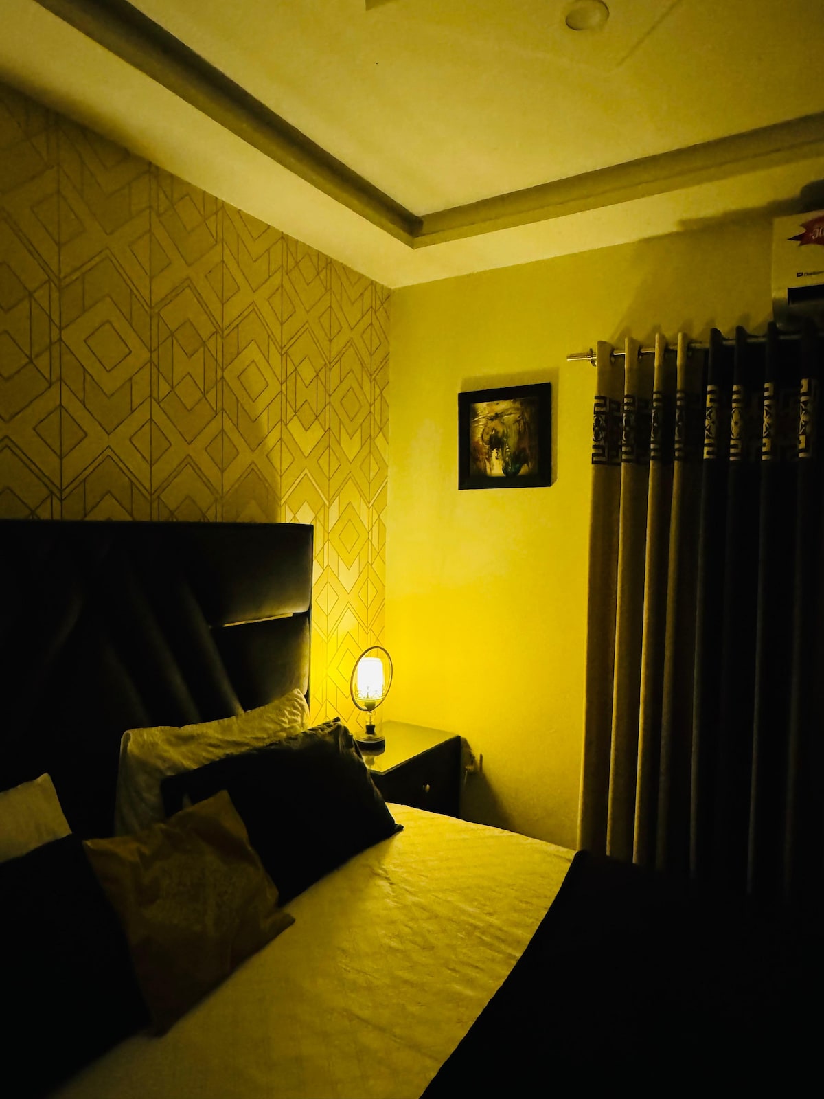 Our 1 BHK Orbit Penthouse in DHA Phase 5 is where urban chic meets celestial cool. Think: a glowing moon wall for those late-night selfies and a bold dollar-stacked art piece that screams "main character energy" Wake up to park views from your private balcony swing, binge your faves on the 50" 4K Smart TV, or cook up something aesthetic in the fully loaded designer kitchen. The interiors? Abstract, stylish, and made for the feed. Plus, you're right next to Lahore's hottest dining spots.