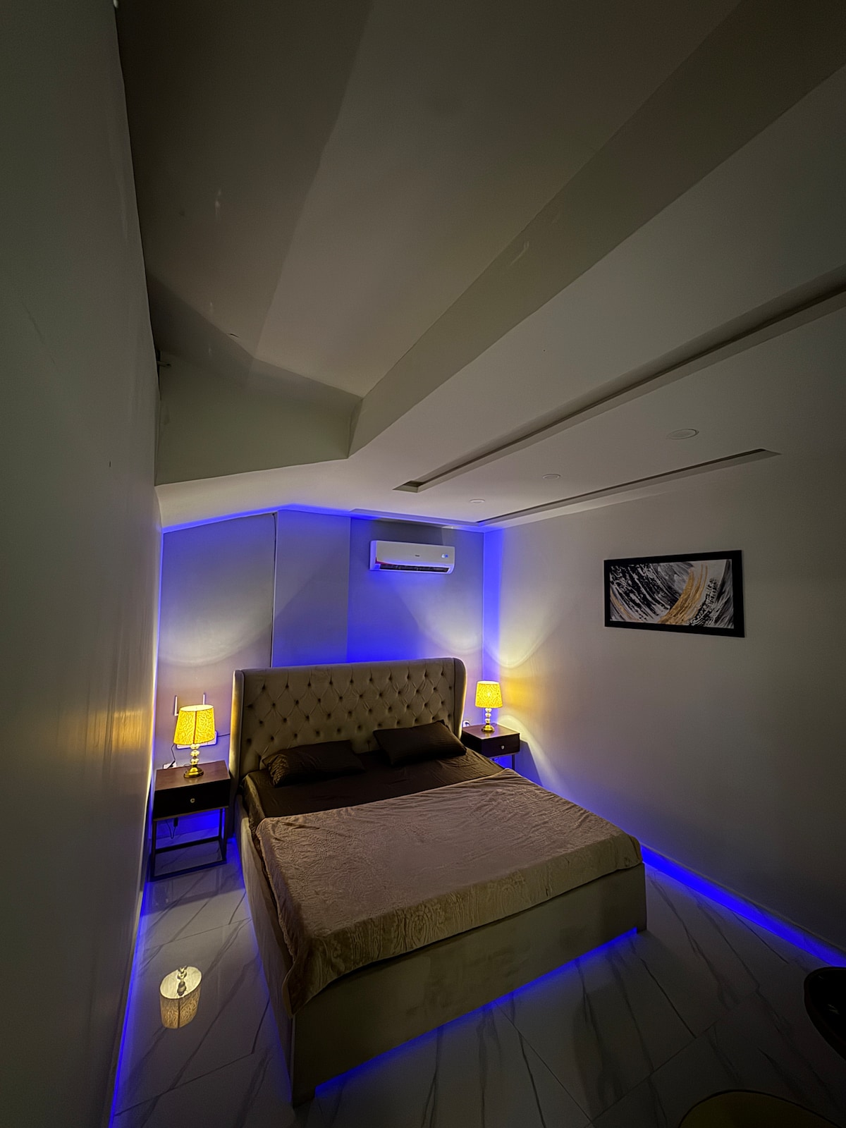 Our 1 BHK Orbit Penthouse in DHA Phase 5 is where urban chic meets celestial cool. Think: a glowing moon wall for those late-night selfies and a bold dollar-stacked art piece that screams "main character energy" Wake up to park views from your private balcony swing, binge your faves on the 50" 4K Smart TV, or cook up something aesthetic in the fully loaded designer kitchen. The interiors? Abstract, stylish, and made for the feed. Plus, you're right next to Lahore's hottest dining spots.