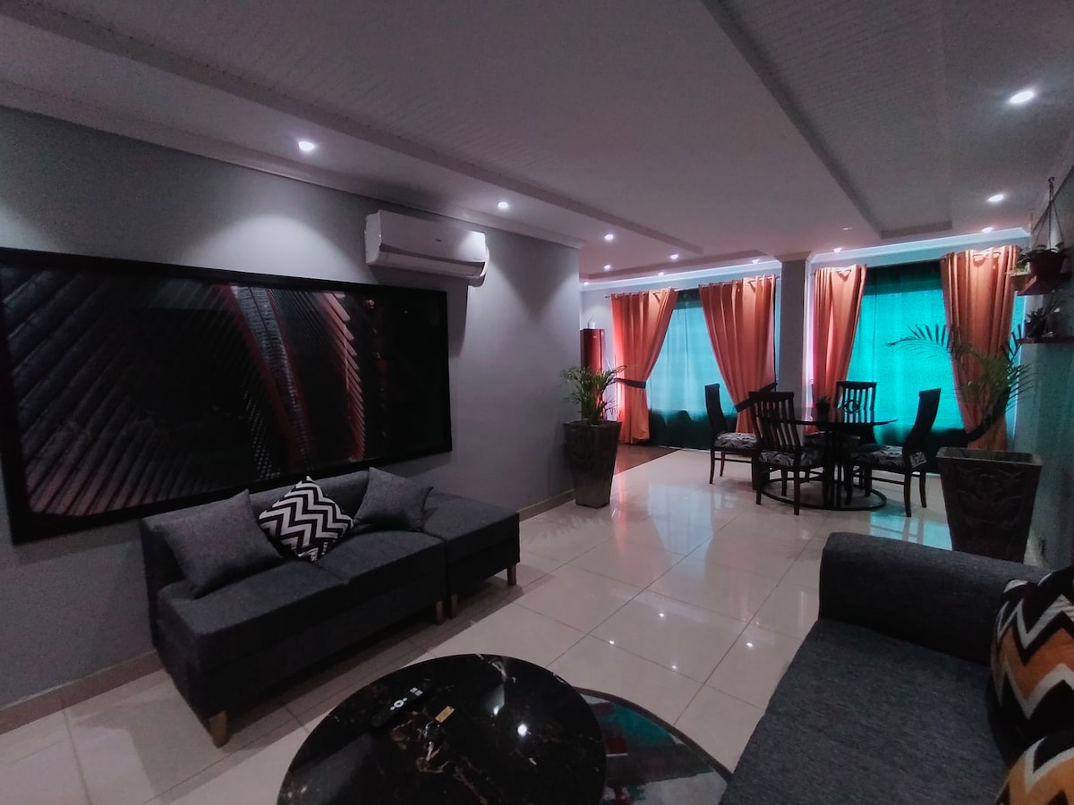 Welcome to Twilight – a one-of-a-kind moon-themed apartment in DHA Phase 6 🌙 • 1-bedroom with cozy lighting & modern design • Stylish lounge with artful décor & 50” Smart LED •Fully equipped kitchen with stove, microwave & kettle • High-speed WiFi & seamless self check-in 📍 Prime location near Raya Commercial, Dolmen Mall, Ring Road and many cafes Your perfect blend of comfort & style. It’s the best option either you are travelling for business or for leisure.