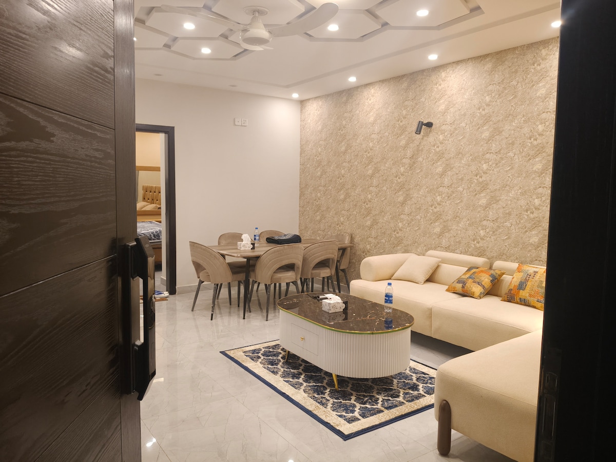 Enjoy the perfect balance of comfort, style, and affordability in this modern apartment located in the heart of Bahria Town, Lahore. ✨ What You’ll Love: • Spacious, fully furnished aprtment • Comfortable bedroom with soft bedding & fresh linens • Modern kitchen with essentials for easy cooking • High-speed WiFi & smart TV for your entertainment • Secure & peaceful environment in Bahria Town