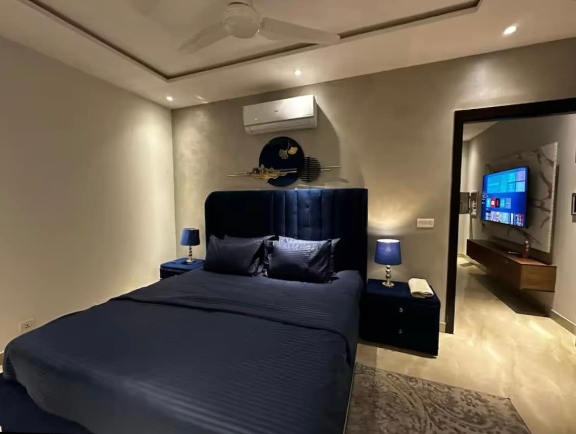 Experience refined living in this beautifully designed canal-view studio. The space features a plus king-size bed, a sleek frosted-glass bedroom partition, and a stylish lounge with a velvet sofa set and a 42” LED, Bose HT, entertainment setup.Soft, warm lighting creates a calm, hotel-style atmosphere, making it perfect for relaxing after a long day. Ideal for romantic getaways, business trips, or anyone who appreciates comfort with a touch of luxury.5-10 min away from airport and from gulberg .