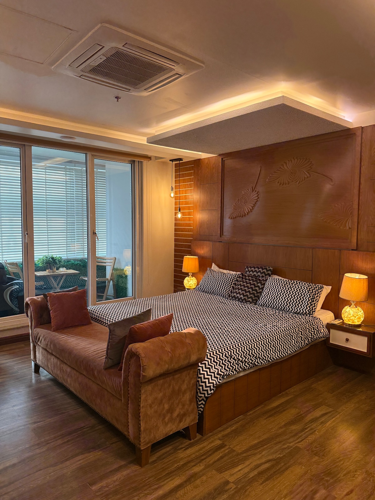 Our 1 BHK Orbit Penthouse in DHA Phase 5 is where urban chic meets celestial cool. Think: a glowing moon wall for those late-night selfies and a bold dollar-stacked art piece that screams "main character energy" Wake up to park views from your private balcony swing, binge your faves on the 50" 4K Smart TV, or cook up something aesthetic in the fully loaded designer kitchen. The interiors? Abstract, stylish, and made for the feed. Plus, you're right next to Lahore's hottest dining spots.