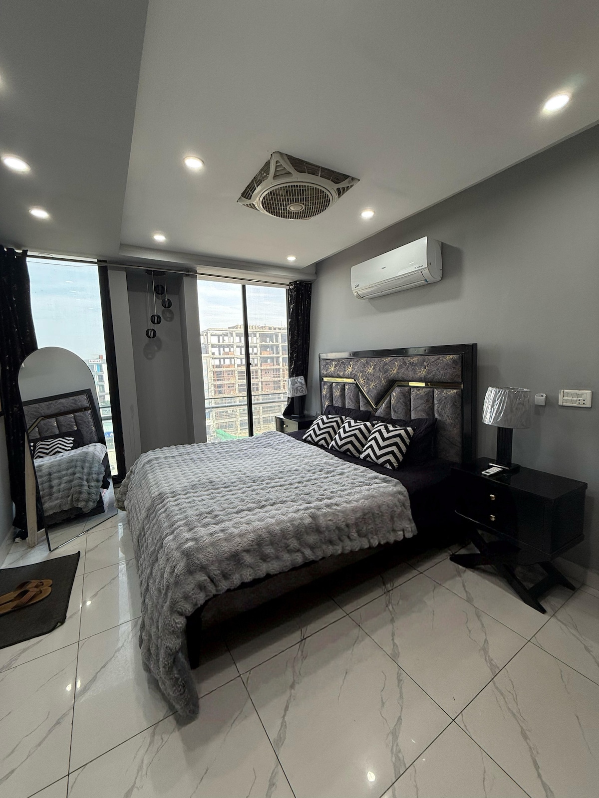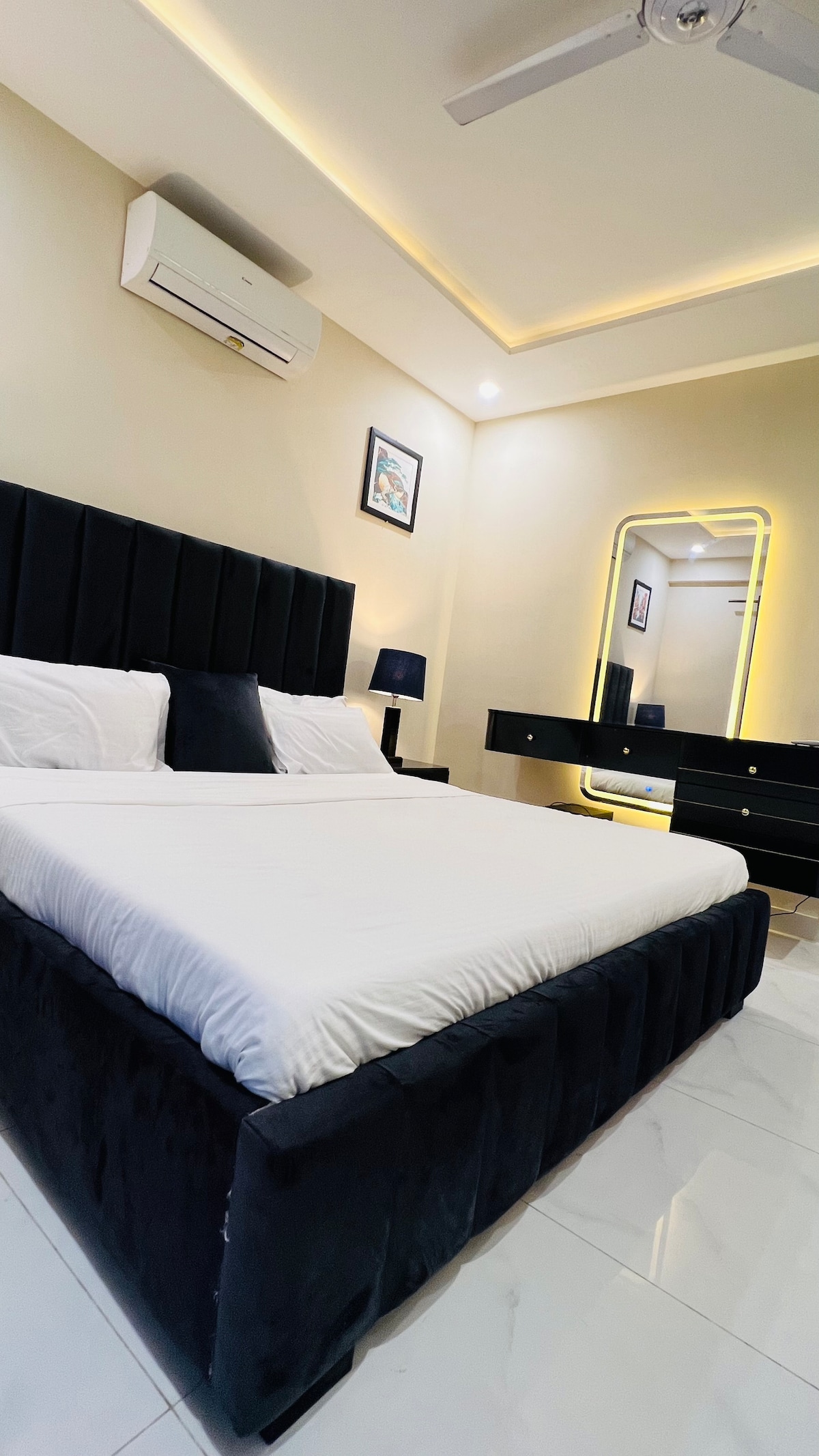 Our 1 BR condo in DHA Phase 5 is where urban chic meets celestial cool. Think: a glowing moon wall for those late-night selfies and a bold dollar-stacked art piece that screams "main character energy" Wake up to park views from your private balcony swing, binge your faves on the 50" 4K Smart TV, or cook up something aesthetic in the fully loaded designer kitchen. The interiors? Abstract, stylish, and made for the feed. Plus, you're right next to Lahore's hottest dining spots.