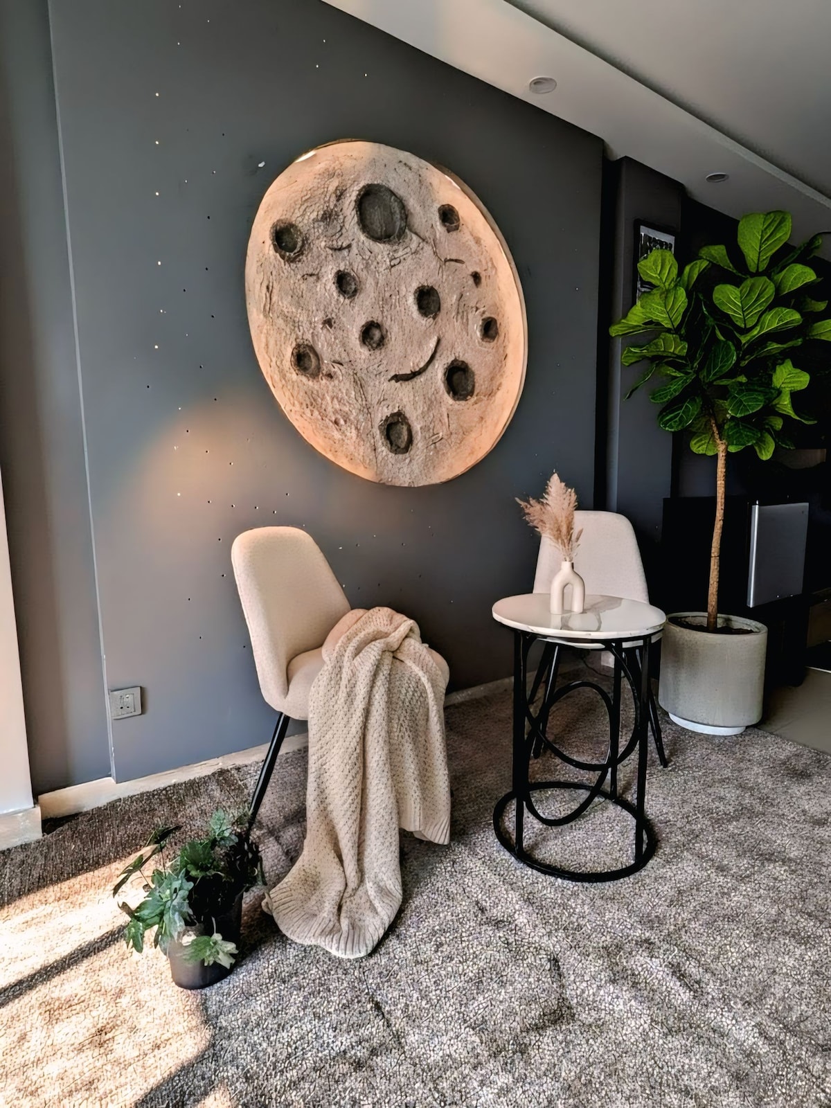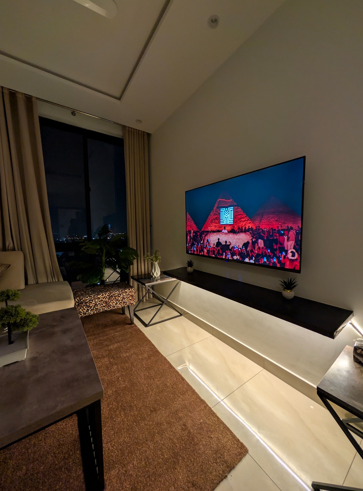 Our 1 BR condo in DHA Phase 5 is where urban chic meets celestial cool. Think: a glowing moon wall for those late-night selfies and a bold dollar-stacked art piece that screams "main character energy" Wake up to park views from your private balcony swing, binge your faves on the 50" 4K Smart TV, or cook up something aesthetic in the fully loaded designer kitchen. The interiors? Abstract, stylish, and made for the feed. Plus, you're right next to Lahore's hottest dining spots.