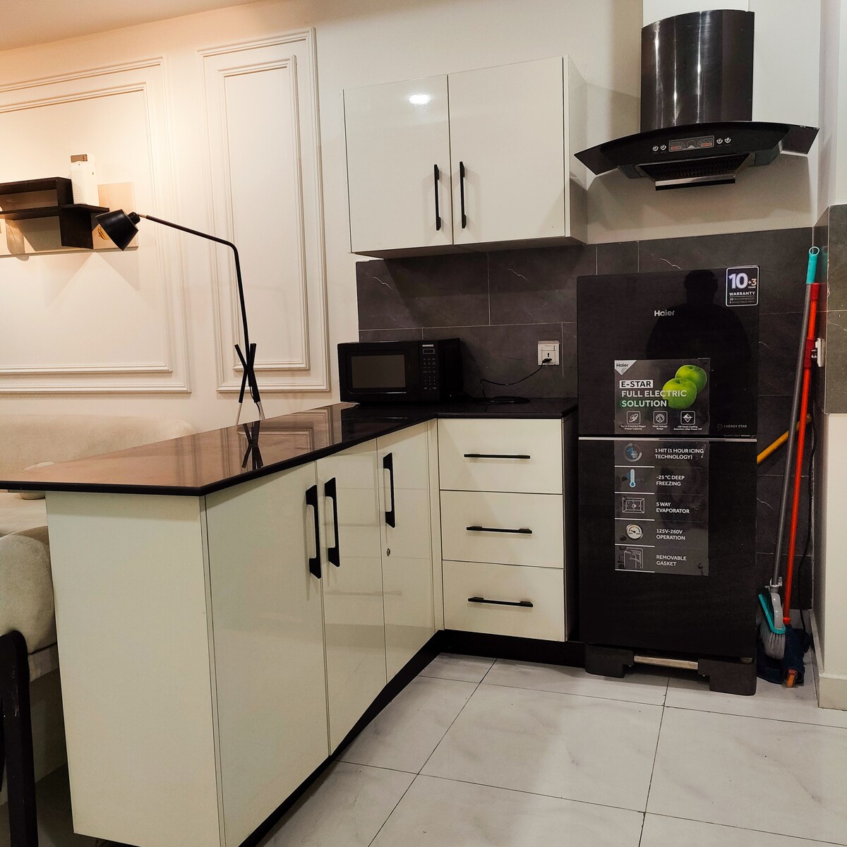 Luxury one-bedroom modern apartment located near KFC in Sector C, Bahria Town Lahore. The apartment is on the 3rd floor with a beautifully designed elevator. Safe, secure, and serene environment with a caretaker to assist guests. Optimum security mechanism inhouse and on street in this community. Ideal for families, travelers, and guests coming from abroad. All necessaries are available at a stone's throw. High-speed WIFI is available. Discounts (16% on weekly and 27% on monthly bookings)