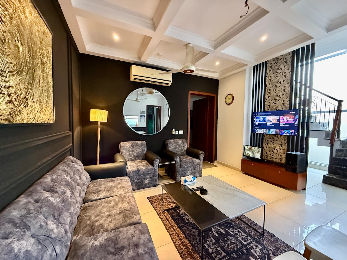Welcome to my peaceful elegant and minimalistic decor 2 bedroom luxury apartment. it is centrally located in Lahore with all the necessary amenities inside it. ---- Free high speed Wifi 24/7 electricity backup on automatic generator Instant hot water Elegantly decorated lounge Both bedrooms have a terrace with a lovely view 3 Inverters ideal for summer and winter 55-inch Samsung Smart TV Voice-activated includes (Prime video, Youtube etc.) Microwave Refrigerator Cloth Iron stand