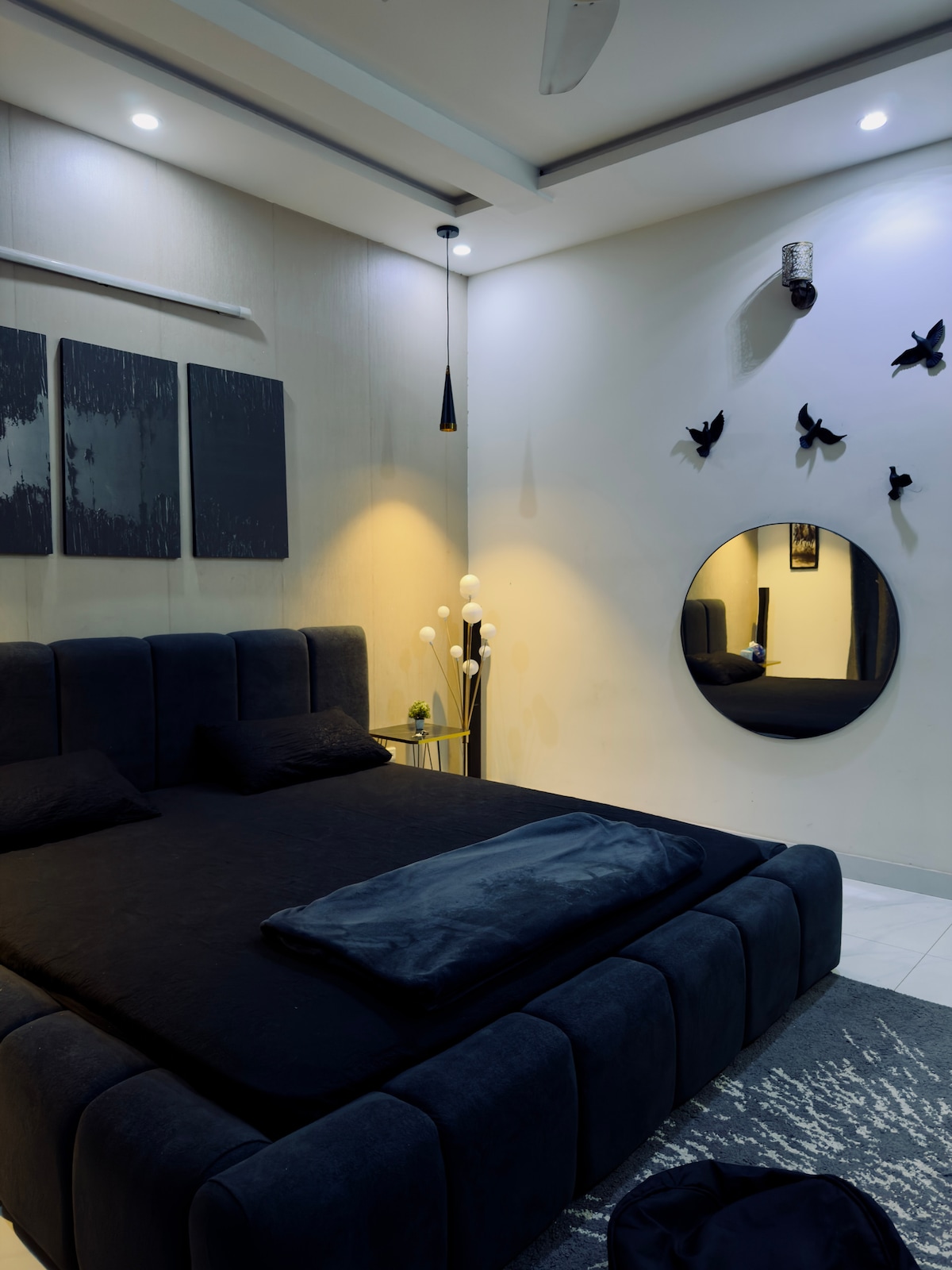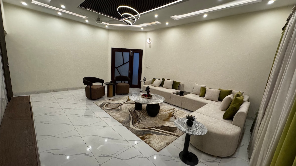 Your home away from home in upscale Wapda Town, Lahore. This 2-bedroom villa offers king beds with en-suite baths, AC, 80” Smart TV with Dolby Atmos, Solar System, Wi-Fi & a workspace. Cook in the fully equipped kitchen, enjoy laundry facilities, and unwind in your garden. Daily housekeeping keeps everything fresh, while secure parking and a dedicated security guard ensure peace of mind. Close to malls, eateries & the airport — perfect for families, business, or leisure stays.