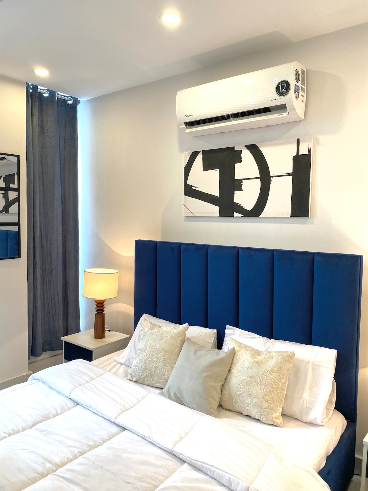 Our 1 BR condo in DHA Phase 5 is where urban chic meets celestial cool. Think: a glowing moon wall for those late-night selfies and a bold dollar-stacked art piece that screams "main character energy" Wake up to park views from your private balcony swing, binge your faves on the 50" 4K Smart TV, or cook up something aesthetic in the fully loaded designer kitchen. The interiors? Abstract, stylish, and made for the feed. Plus, you're right next to Lahore's hottest dining spots.