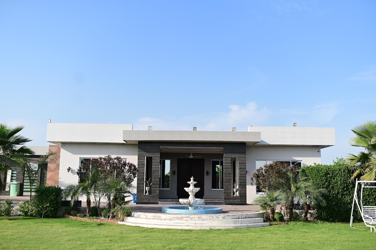 Relax with the whole family at this peaceful place to stay. Escape to our serene farmhouse in Pakistan's countryside 🌳. Spacious rooms, lush gardens, and breathtaking views. Perfect for family gatherings or corporate retreats. Relax in our tranquiloasis with modern amenities and warm hospitality. Book now for a peaceful getaway!