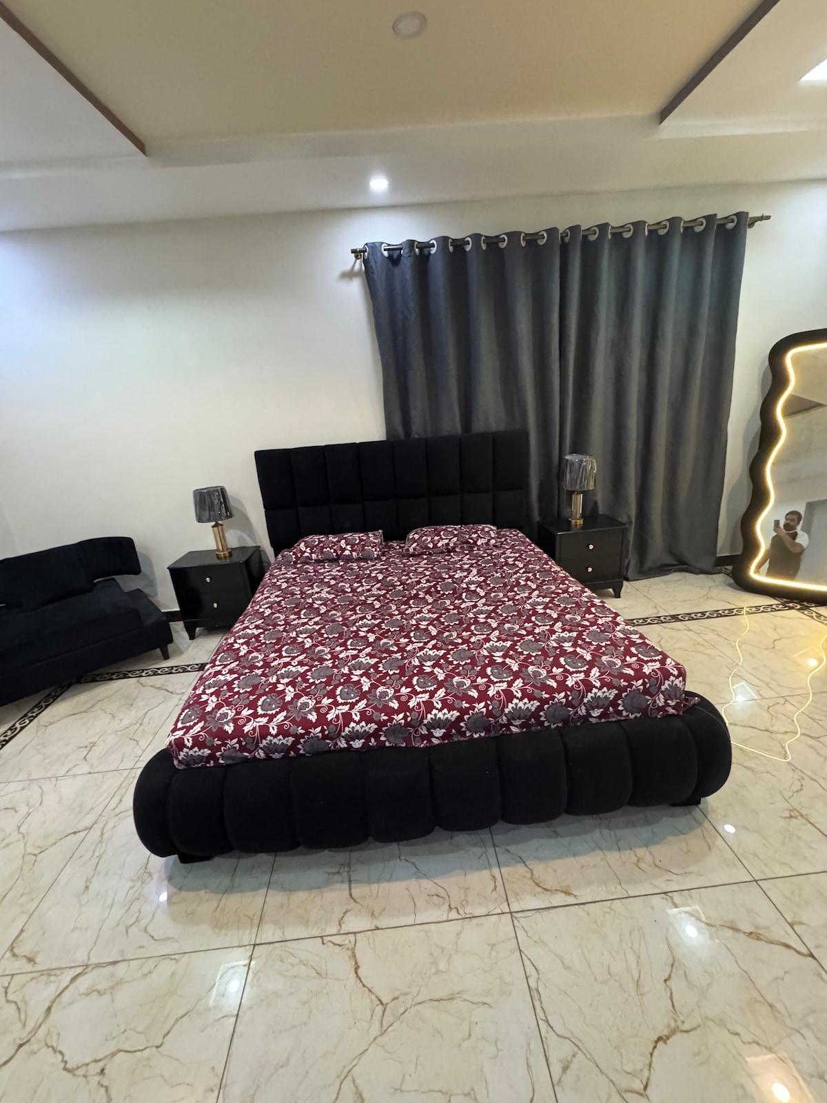 Located at 7 minutes drive from PKLI hospital , in a quiet neighborhood with easy access to DHA phase 6 , and family-friendly attractions like golf raya club and fairways commercial , it's ideal for a family vacation surrounded by lush green lawns. This guest house With 1 Master bedroom having a king size bed sleeps 2 with spacious room for 2 matresses accomodating 4 people and has a wardrobe, drawers, long mirror, table, ottoman with storage and a window that looks out over the front garden.